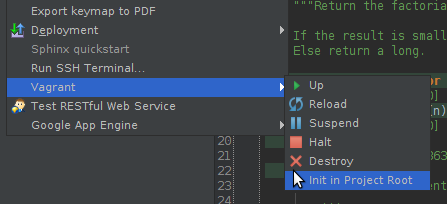 First you need to initialize a Vagrantfile for your project. Select “Init in Project Root” in the menu to automatically create the Vagrantfile, and you will be able to see and modify it like any other file within your project.