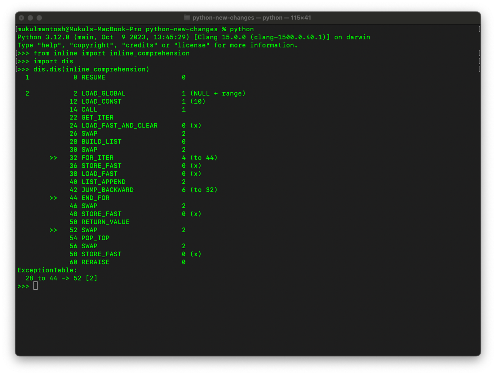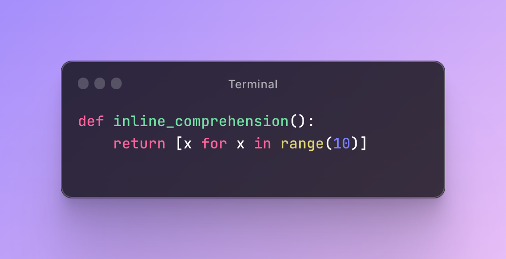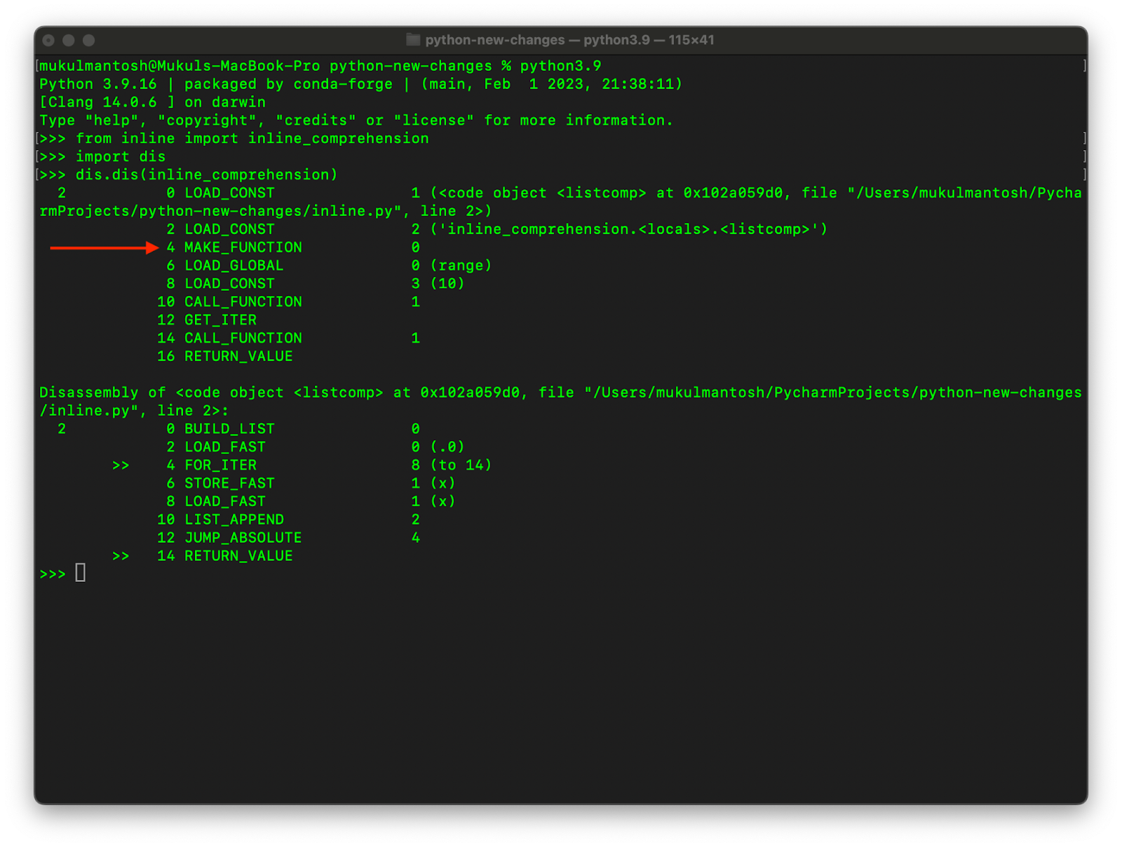 The comprehension’s bytecode is contained within an individual code object. Whenever inline_comprehension() is invoked, a new temporary function object is created via MAKE_FUNCTION, executed (resulting in the establishment and subsequent removal of a new frame on the Python stack), and promptly discarded.
