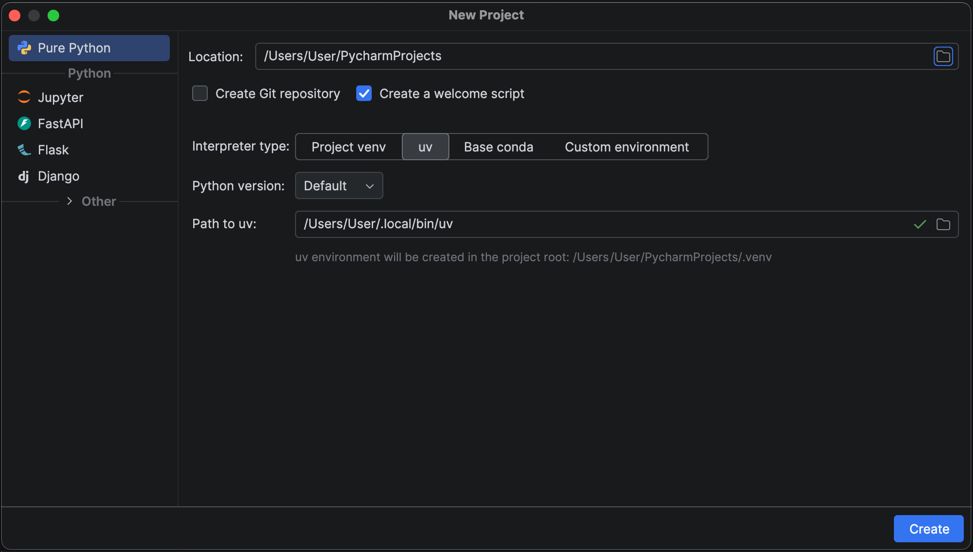 When uv is detected on your system, PyCharm now automatically suggests it as the default environment manager in the New Project wizard.