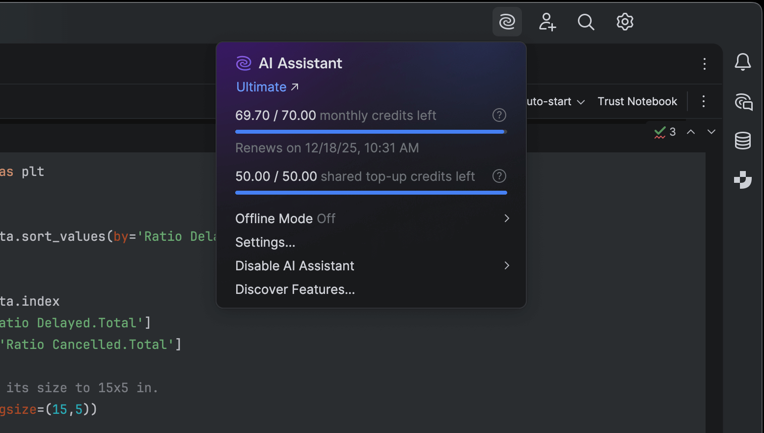 Monitoring and managing your AI resources just got a lot easier, as you can now view your remaining AI Credits, renewal date, and top-up balance directly inside PyCharm.