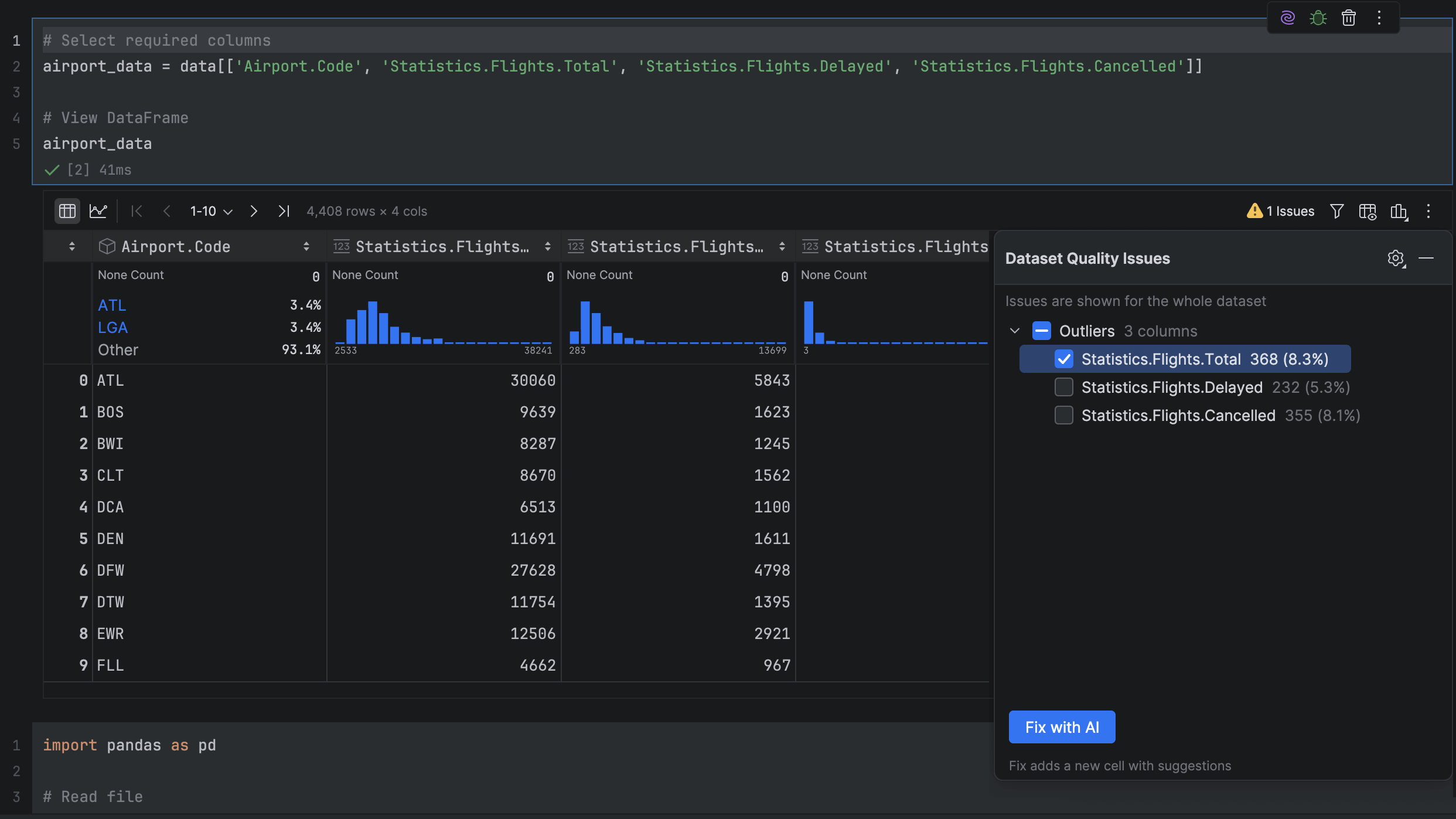 PyCharm now automatically analyzes your pandas DataFrames to detect the most common data quality issues. If any are found, you can review them and use Fix with AI to generate cleanup code automatically.