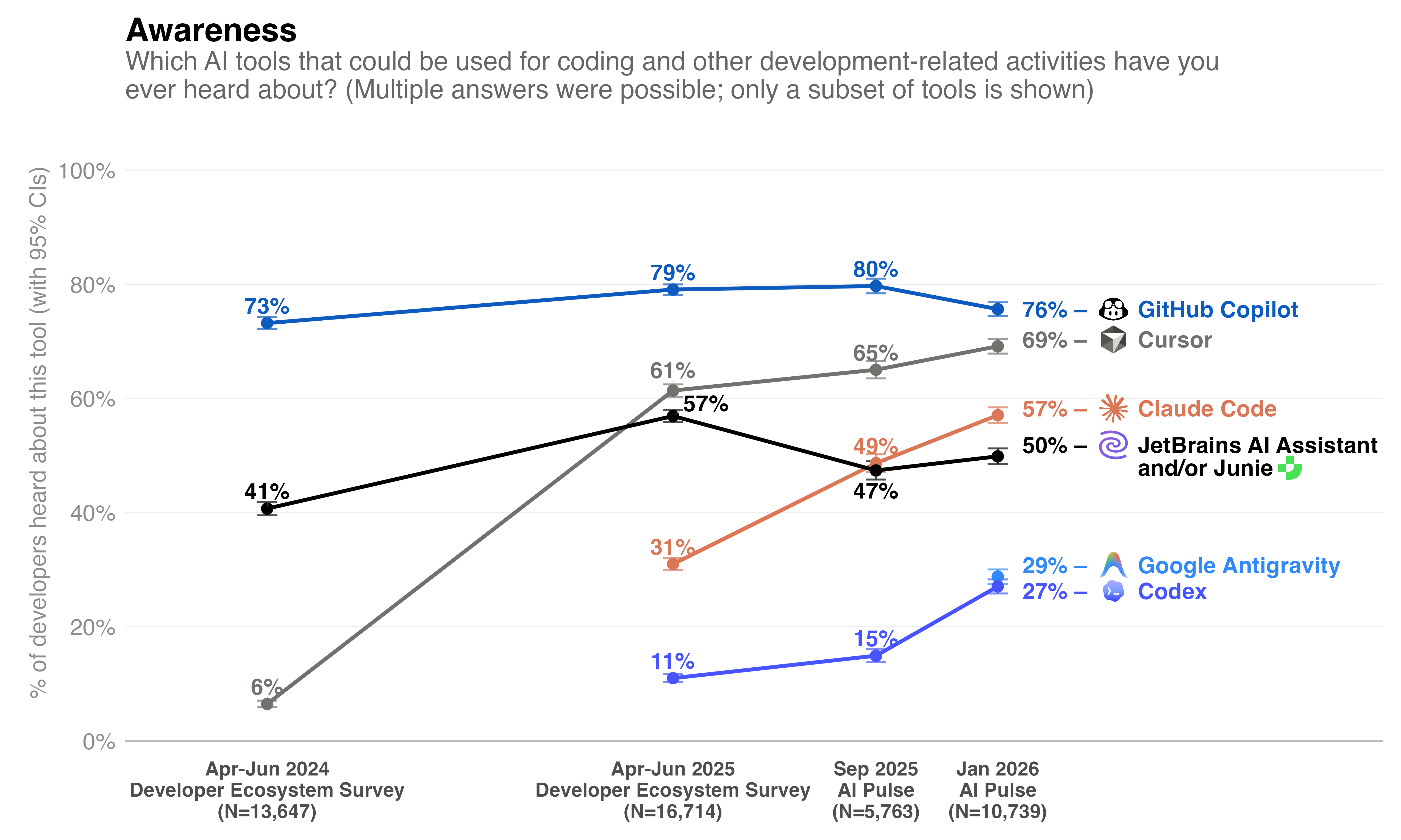 We are now ready to share how AI coding tools like Claude Code, Cursor, JetBrains AI Assistant, Junie, GitHub Copilot, OpenAI Codex, and Google Antigravity have evolved over the past two years in terms of awareness, adoption, and satisfaction. The data is based on the September 2025 and January 2026 AI Pulse surveys, as well as the 2024 and 2025 waves of the JetBrains Developer Ecosystem Survey, which is well-known in the community.