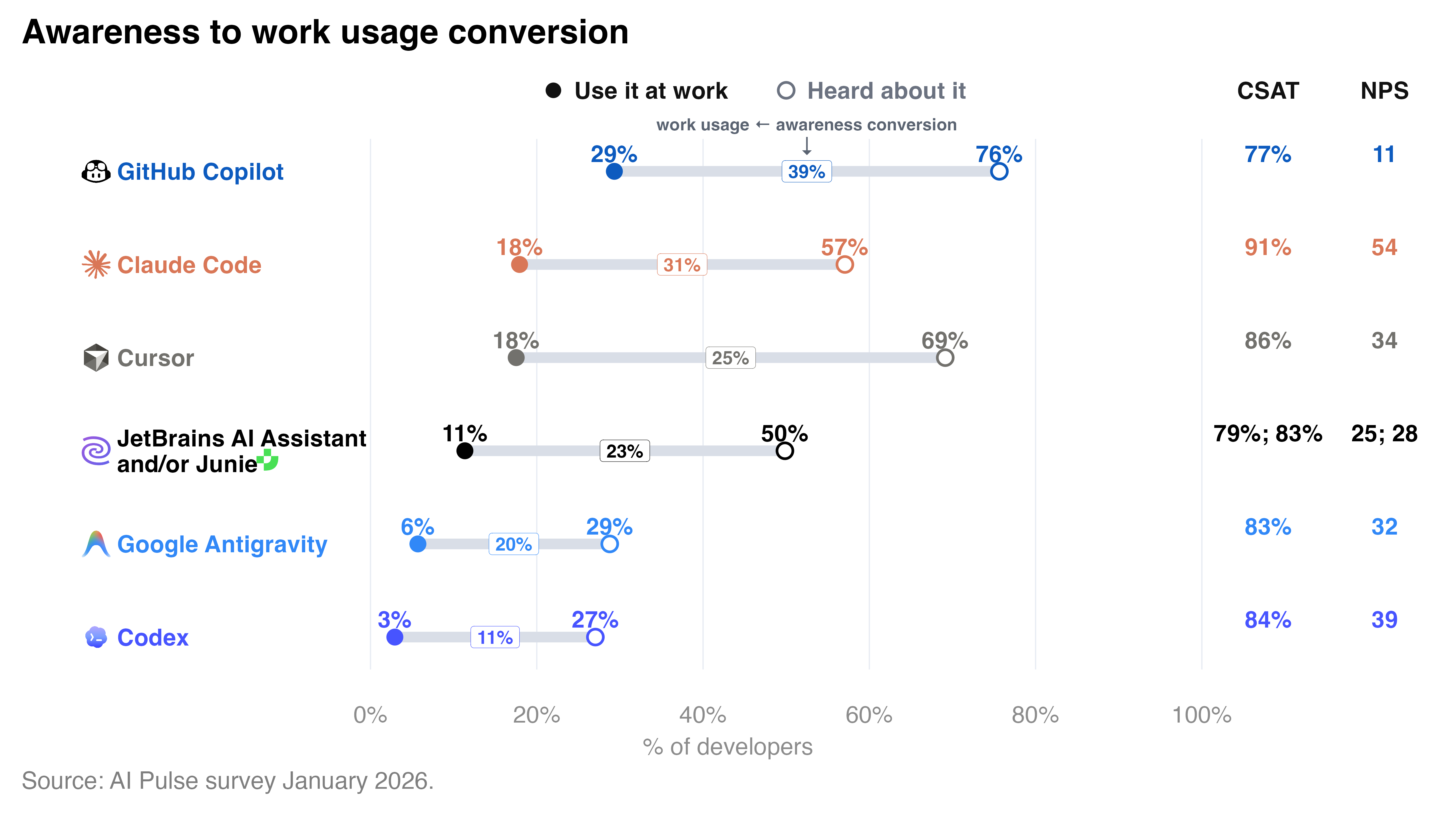 Claude Code is continuing to rapidly grow in awareness, adoption, and admiration. 57% of developers had heard of it in January 2026, compared to 49% in September 2025 and 31% in April–June 2025, and 18% currently use it at work, a 1.5x increase from September 2025 and 6x increase from roughly 3% in April–June 2025. In the US and Canada, its adoption even reached 24% in January 2026. It also has the highest product loyalty metrics on the market, with a CSAT (satisfaction) of 91% and an NPS (likelihood to recommend) of 54 (on a scale from -100 to +100).