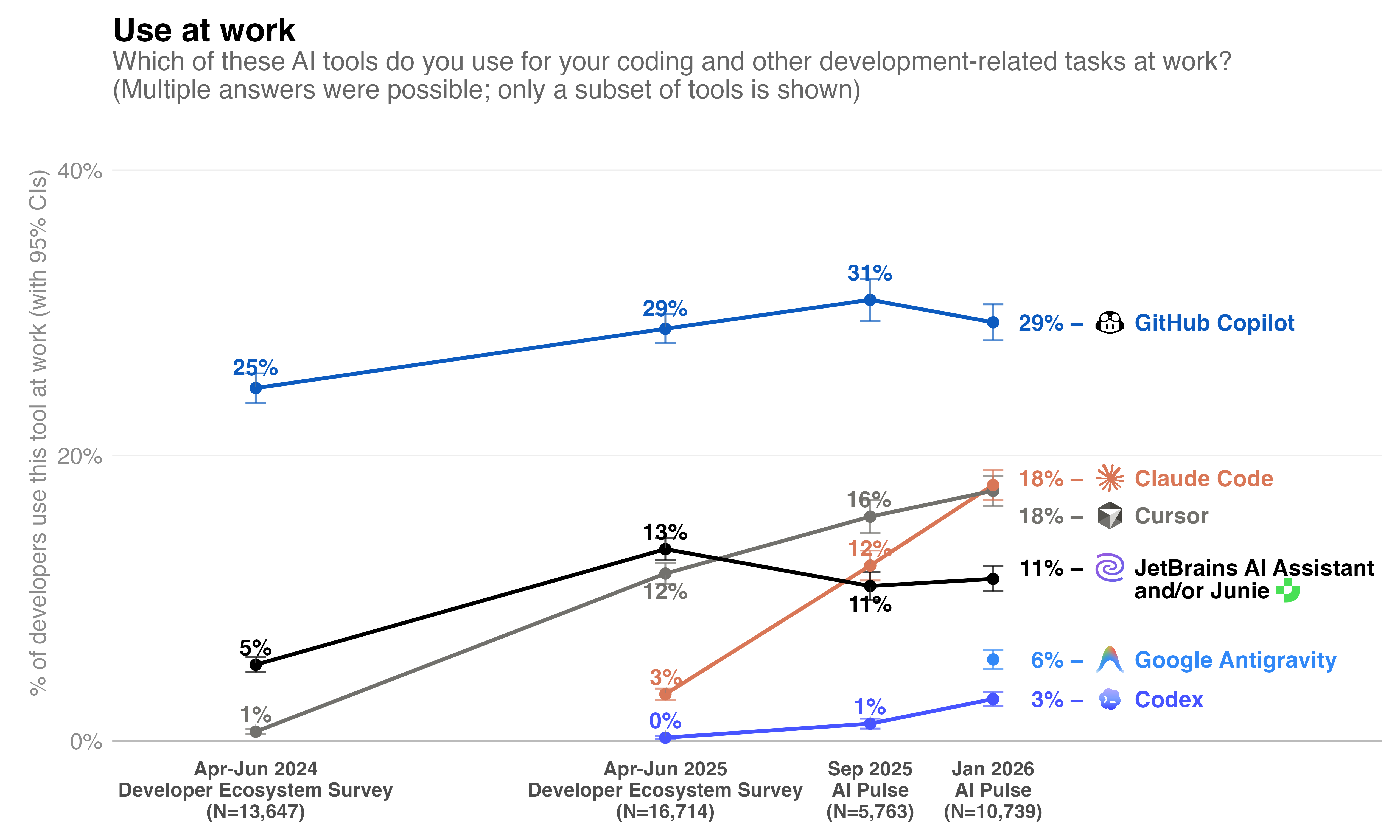We’ll continue tracking how the AI dev tools landscape evolves, especially regarding the use of AI coding agents and related adoption challenges at the organizational level. We will cover this topic in the forthcoming Developer Ecosystem Survey 2026, which will launch in April with results to follow soon thereafter. Stay tuned!