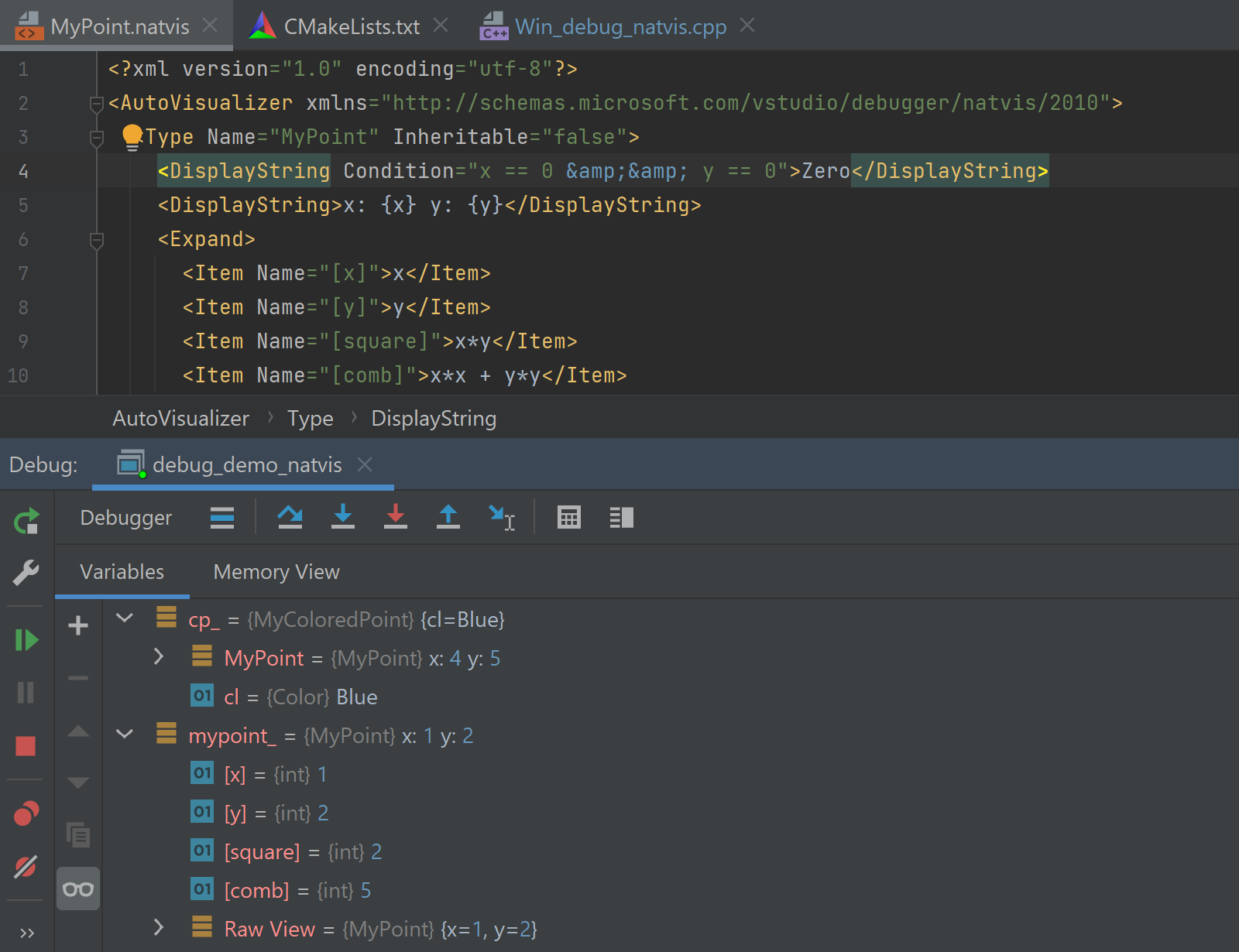 Для тех, кто разрабатывает на Windows с использованием тулчейна MSVC, мы написали собственный отладчик на базе LLDB (отладчик из Visual Studio мы не можем использовать по лицензионным соображениям). Этот же отладчик используется в раннем превью Rider for Unreal Engine (версии IDE JetBrains Rider для разработки игр под Unreal Engine), поэтому мы уделили особое внимание поддержке Natvis — формата для описания визуализации данных в отладчике. В новой версии CLion мы переписали поддержку Natvis, и теперь: