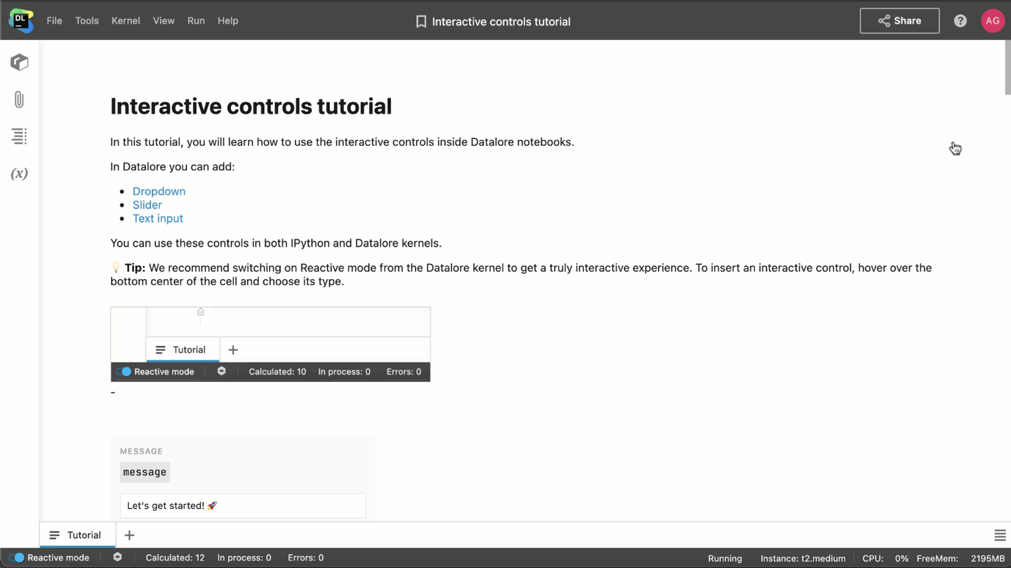 Мы пошли дальше, и теперь интерактивные раскрывающиеся списки, ползунки и поля текстового ввода доступны прямо в интерфейсе редактора. Чтобы вставить интерактивный элемент управления, просто выберите нужный тип и добавьте новую ячейку. Каждый интерактивный элемент управления соответствует переменной, которую затем можно использовать в коде.