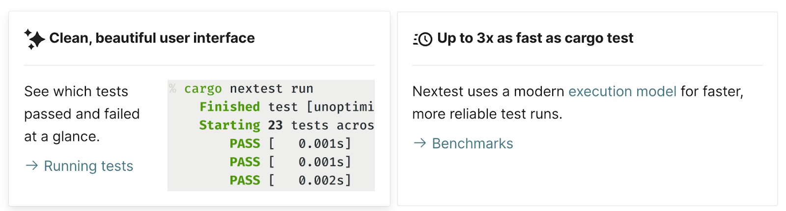 • Actionable output. Nextest provides structured, color-coded output designed to highlight the critical information. It simplifies failure analysis by grouping retries and providing summary statistics.