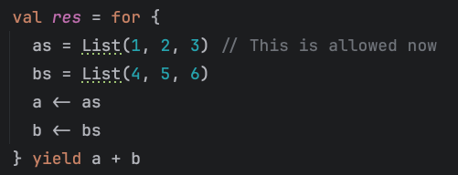 “Better fors” might sound a bit awkward for a feature name, but it introduces a significant and long-anticipated syntax relaxation for Scala’s for-comprehensions. Previously, a for-comprehension had to start with a generator, such as number <- List(1, 2, 3). If you wanted to use an alias, like list = List(1, 2, 3), you had to place it after a generator or define it before the entire for-comprehension and save the result as a value. Now, Scala 3.8 and the Scala plugin support having just the alias before a generator and transforming it into a value automatically.