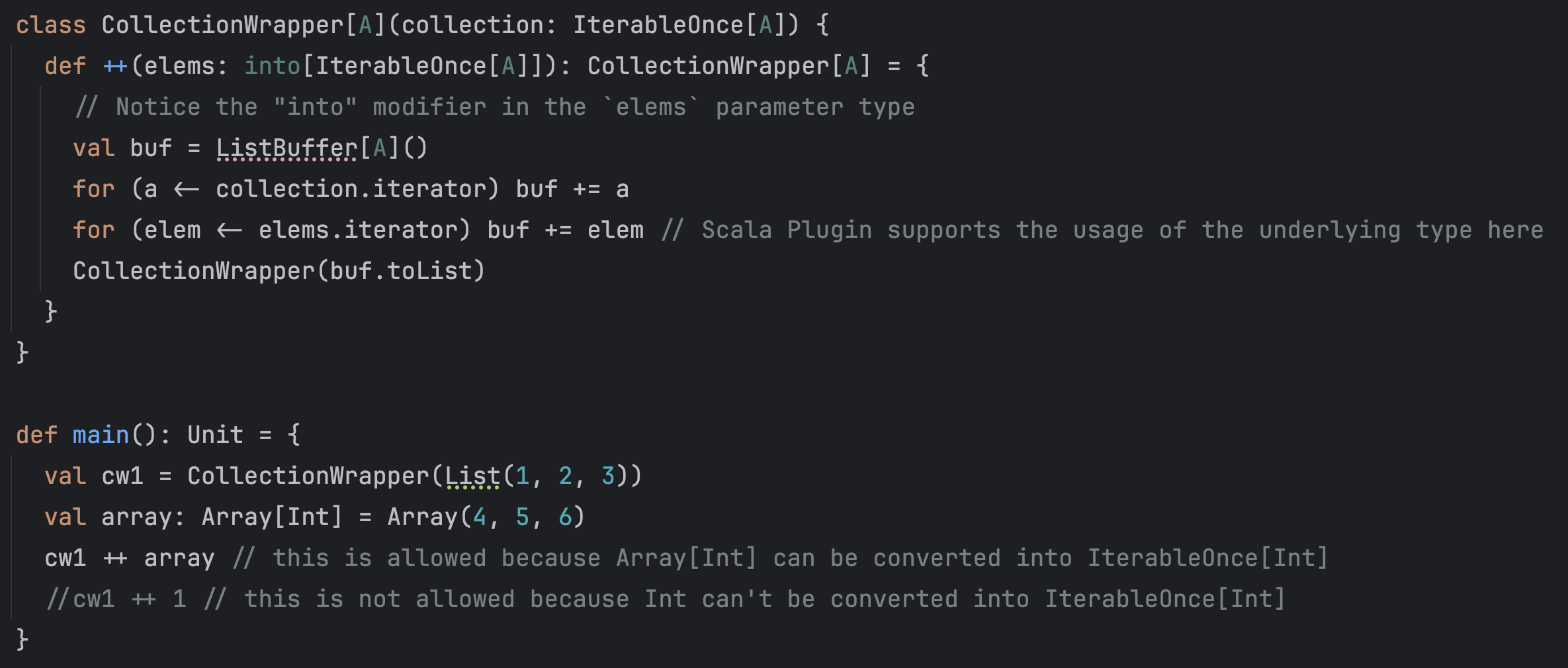 There’s a new modifier in Scala syntax, into, that can be used in two ways: as a wrapper over a type or as a soft keyword in front of classes, traits, opaque type aliases, and enum types. By wrapping a type with into[T] – for example, a type of a function parameter – we indicate that any type implicitly convertible to the declared type inside the into wrapper is accepted without requiring the implicitConversions import. The Scala plugin understands this mechanism, correctly infers types, and highlights cases where the conversion isn’t possible. In the future, using an implicit conversion without the implicitConversions import will be treated as an error.