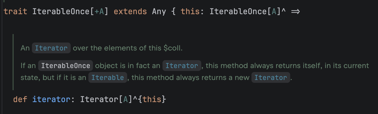Notice that into is used as a type wrapper for elems, but at the same time we can still use elems.iterator as if elems was of the underlying type IterableOnce[A].