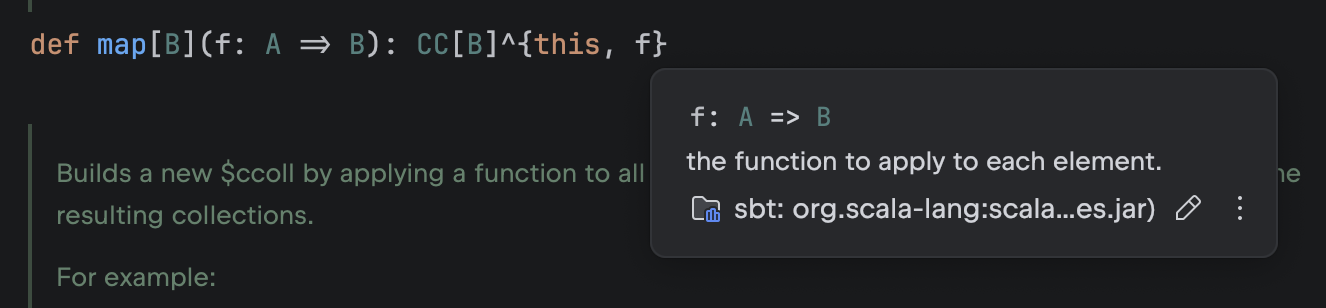 As you can see in the screenshots, the code in the Scala 3.8 version of this class already uses one of the new features: capture checking. Currently, the Scala plugin only supports basic syntax for capture checking, and even this support is experimental. Our goal was to enable you to navigate the Scala standard library code without encountering error highlighting, view type information for captures, and jump to their declarations.