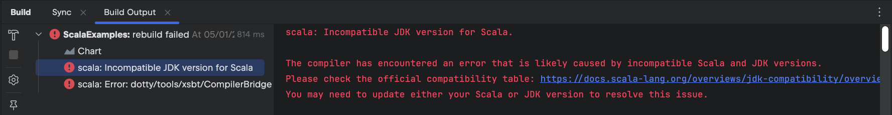 • In existing projects: If your Scala project or any of its modules requires Scala 3.8+ but is being compiled on a JDK version lower than 17, IntelliJ IDEA will display a special warning.