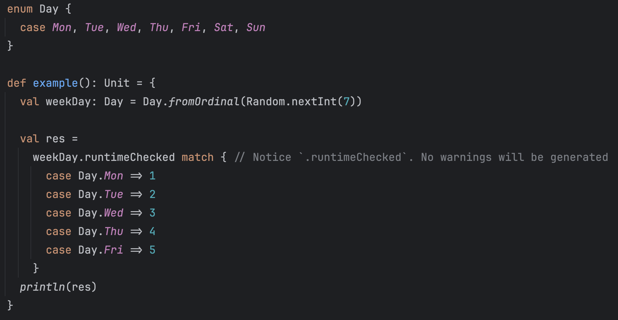 The runtimeChecked method is an extension method defined in scala.Predef that can be called on any expression. When an expression ends with .runtimeChecked, it is exempt from certain static checks in the compiler, such as pattern match exhaustivity. The Scala plugin supports this feature out of the box. For example, if you write a pattern match that misses some cases – as in the screenshot below that defines all days of the week, but then uses only five of them in a match case – the Scala plugin displays a warning that the pattern matching is not exhaustive. If you decorate the value used for pattern matching with .runtimeChecked, the warning will not be displayed.