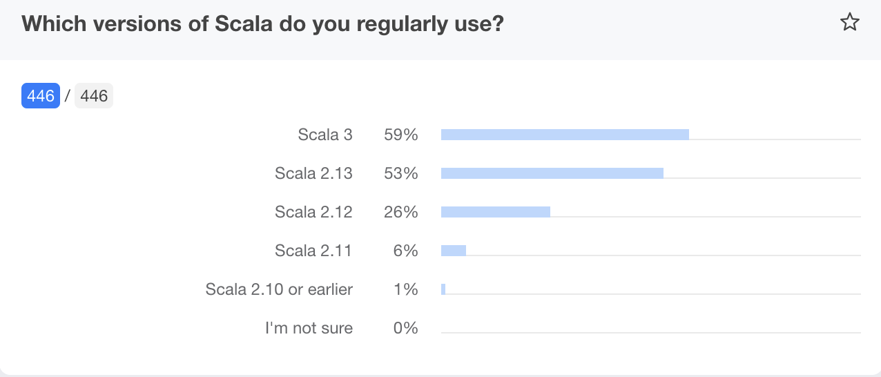 Among the 446 people who answered this question, 274 (59%) answered that they use Scala 3 regularly. “Regularly” is a keyword here. We also asked about your usage of different Scala versions at home and at work. Although versions 2.13 and 2.12 are still in use, the percentage of developers who have already switched to Scala 3 but still use Scala 2 at work adds another 15% to the result.