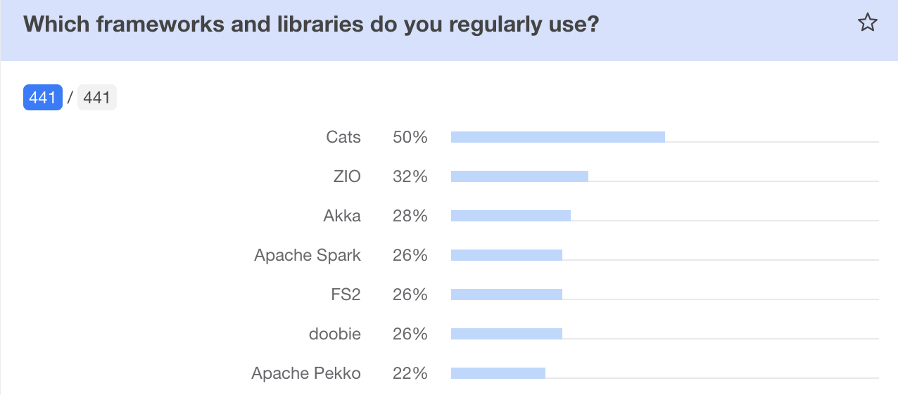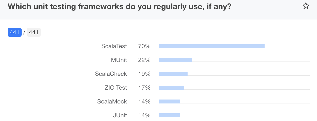 ScalaTest maintains its top position at 70% (down from 71% last year), but MUnit and ZIOTest are on the rise, coming in at 22% and 17%, respectively (as opposed to 19% and 8% last year).