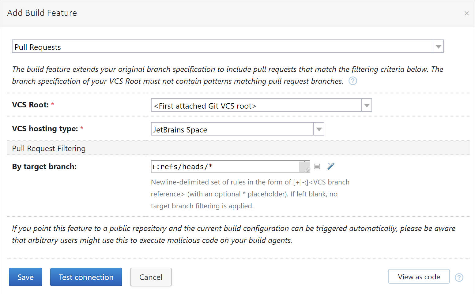 This is the same connection that is required for publishing build results back to Space. So, if you have previously configured the Commit Status Publisher feature for Space, you can use the same connection. Note that each of these features requires own set of access rights. - Add the new Pull Requests feature of the JetBrains Space type: