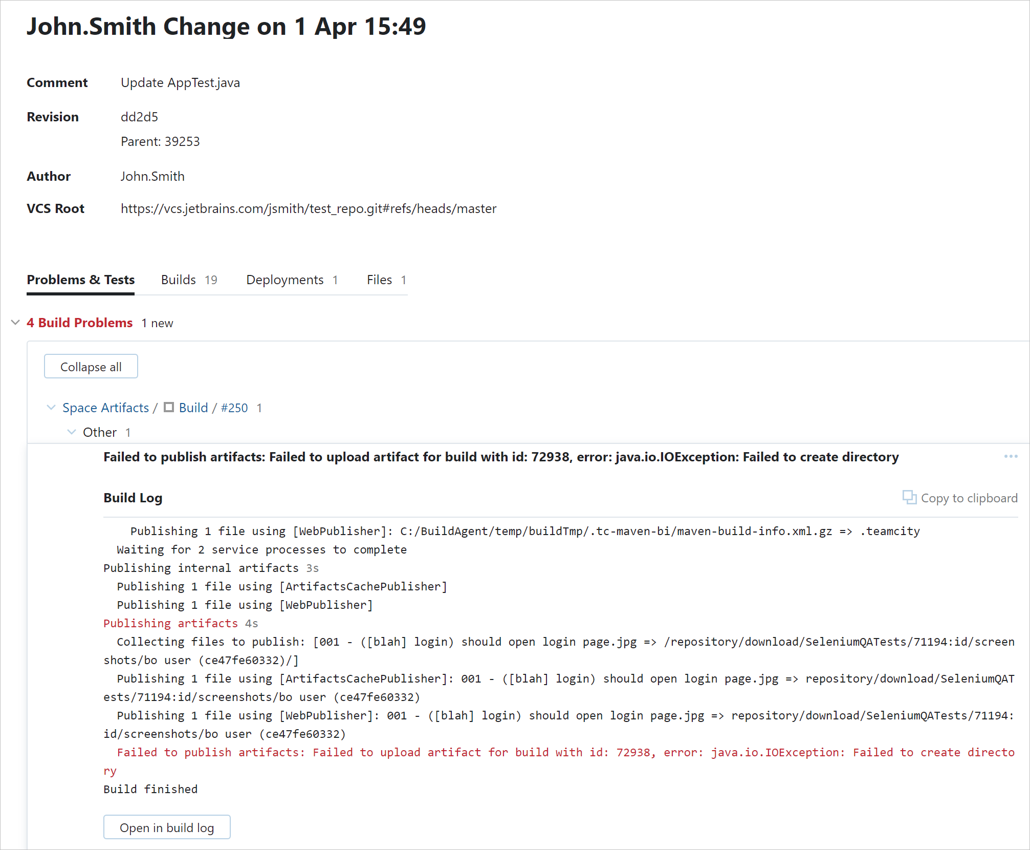 If the Commit Status Publisher feature is also added to the current build configuration, TeamCity will report the build status back to Space — you will see it in the details of the related commit.