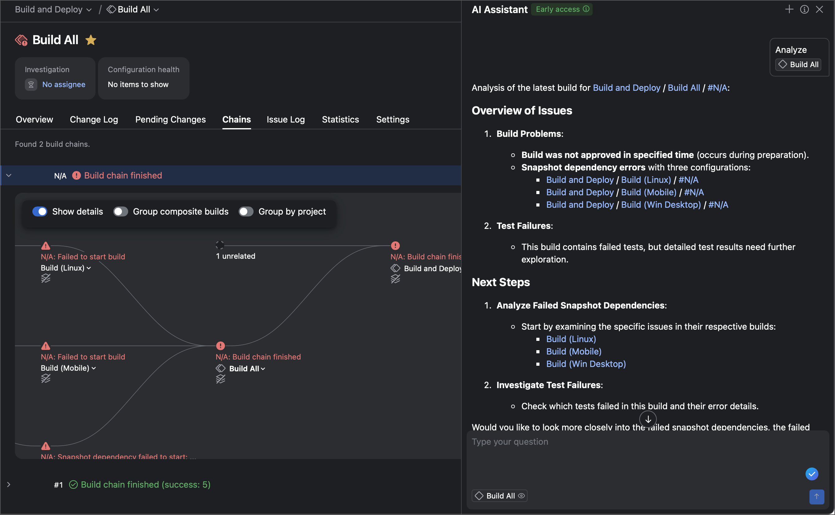 TeamCity is a true powerhouse, but mastering every one of its features can be challenging. To help you get the most out of it, we’re shipping the latest version with AI Assistant available directly from the TeamCity UI. Whether you’re learning the basics or troubleshooting tricky builds, it provides context-aware guidance and insights to keep your workflows running smoothly.