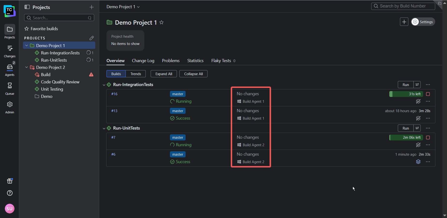 TeamCity’s architecture allows tests to run in parallel using separate build agents. So instead of two (or more) builds running consecutively, they’ll run simultaneously, providing faster feedback to developers and thus shortening the release cycle: