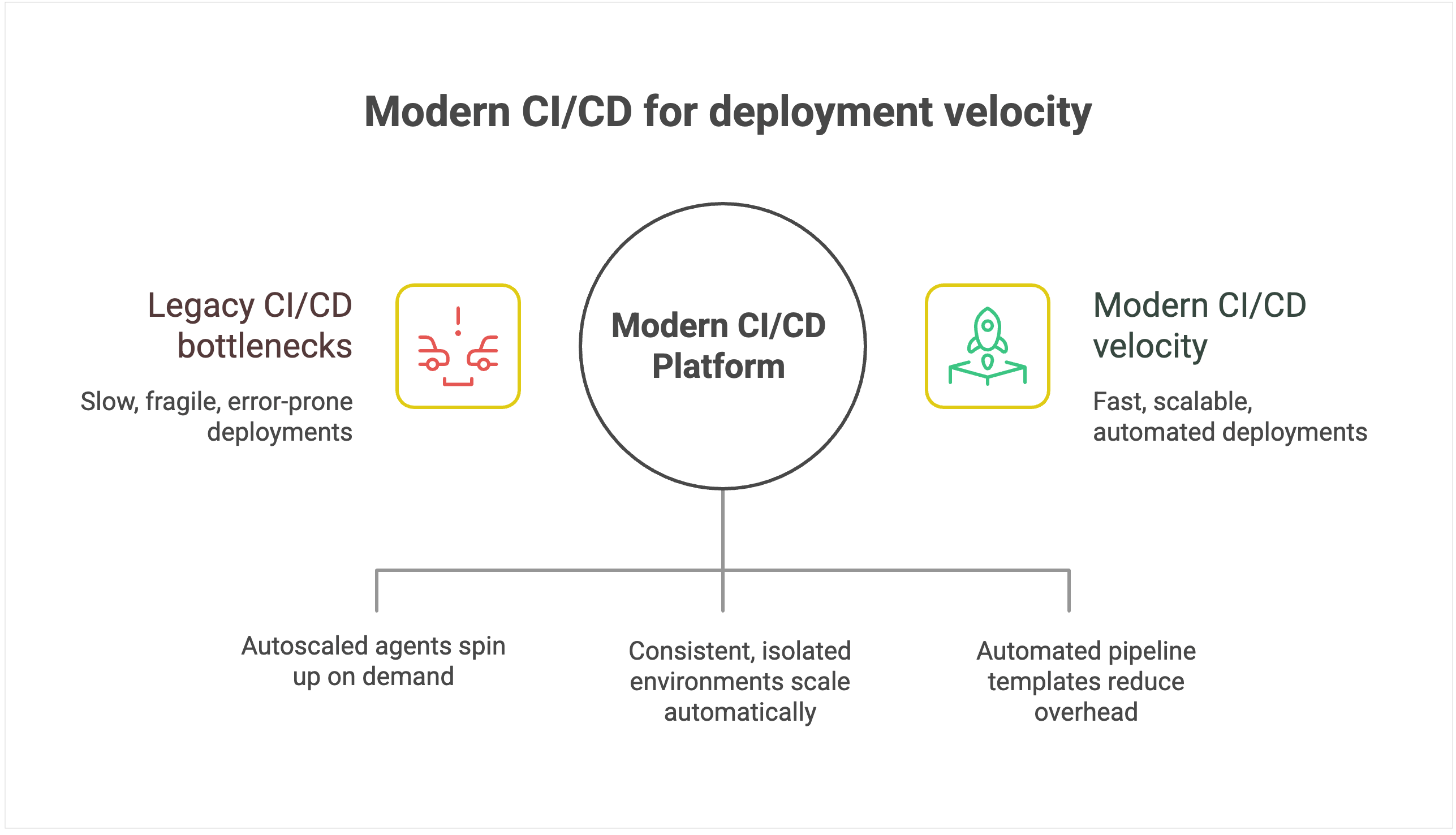 Legacy CI/CD systems create an invisible ceiling on deployment velocity because their architecture introduces scaling bottlenecks. They were designed around static servers, long-lived agents, and plugin ecosystems, which is fine for a handful of apps but fragile when hundreds of pipelines and contributors pile on.