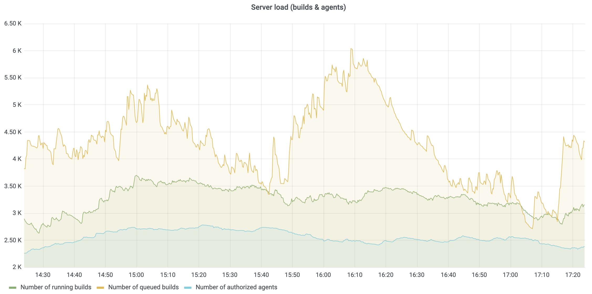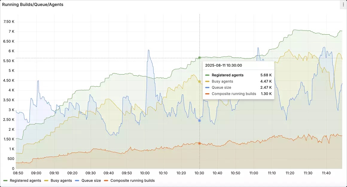 Instead, you want to use a CI/CD platform that offers automated, intelligent response capabilities. For instance, TeamCity’s built-in observability for the CI/CD platform itself tracks server load, agent utilization, build queue health, and pipeline performance. These metrics can be exported to Prometheus and visualized in Grafana so that platform teams can monitor their CI/CD backbone alongside application and infrastructure metrics.