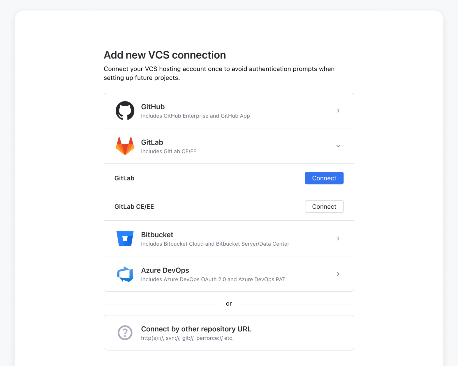 Connecting TeamCity to your version control system is now simpler than ever. We’ve introduced a new connection interface that guides you through linking your GitHub, GitLab, or Bitbucket account before creating a VCS root.
