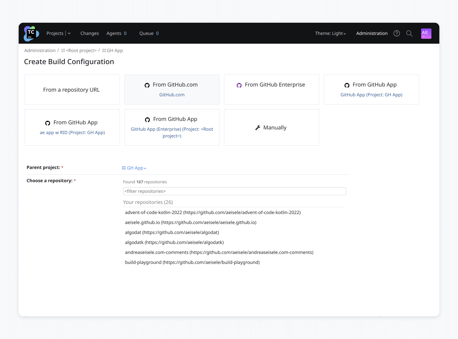 Once the integration is set up, TeamCity can automatically find your repositories by name and help you configure the VCS root with just a few clicks.
