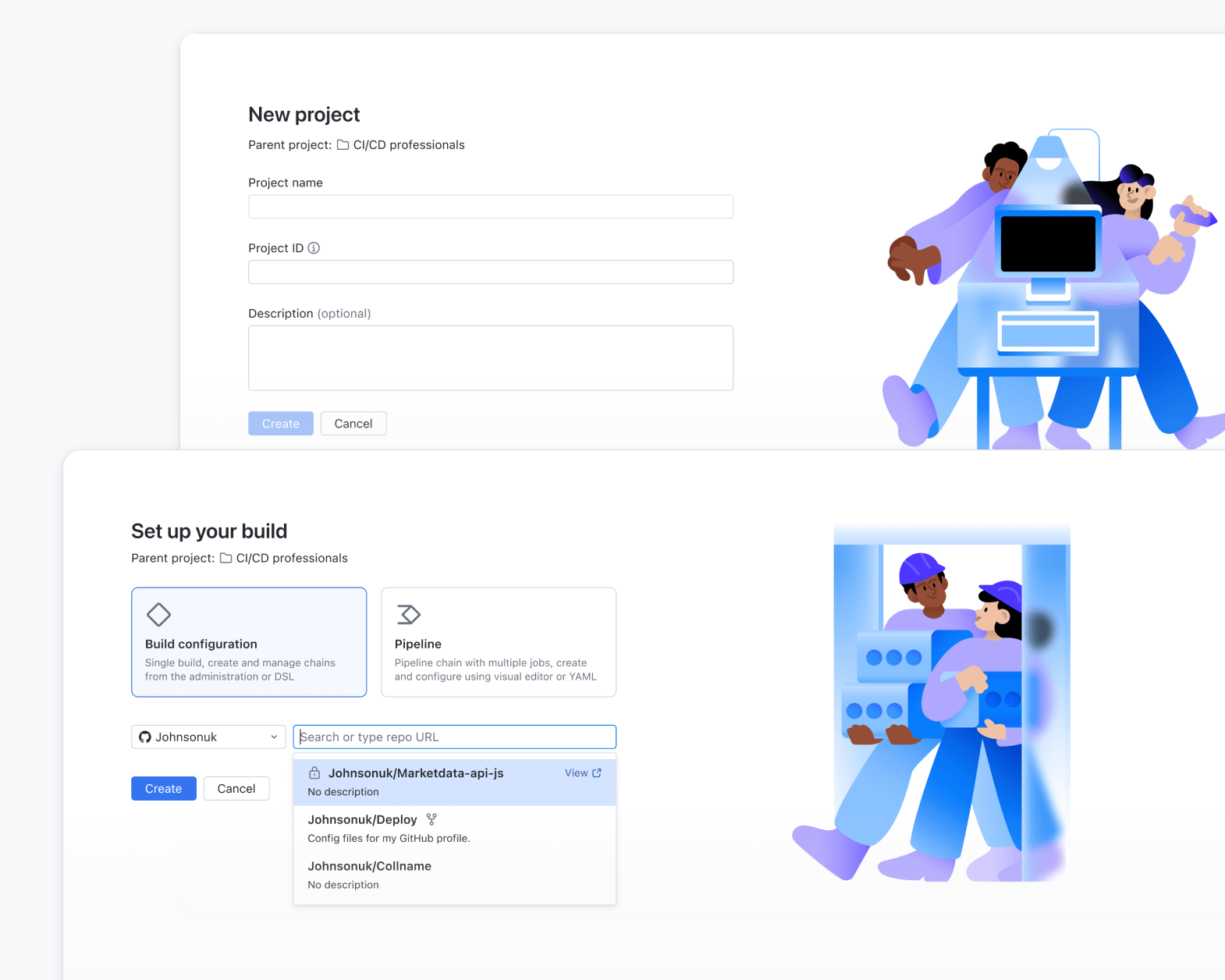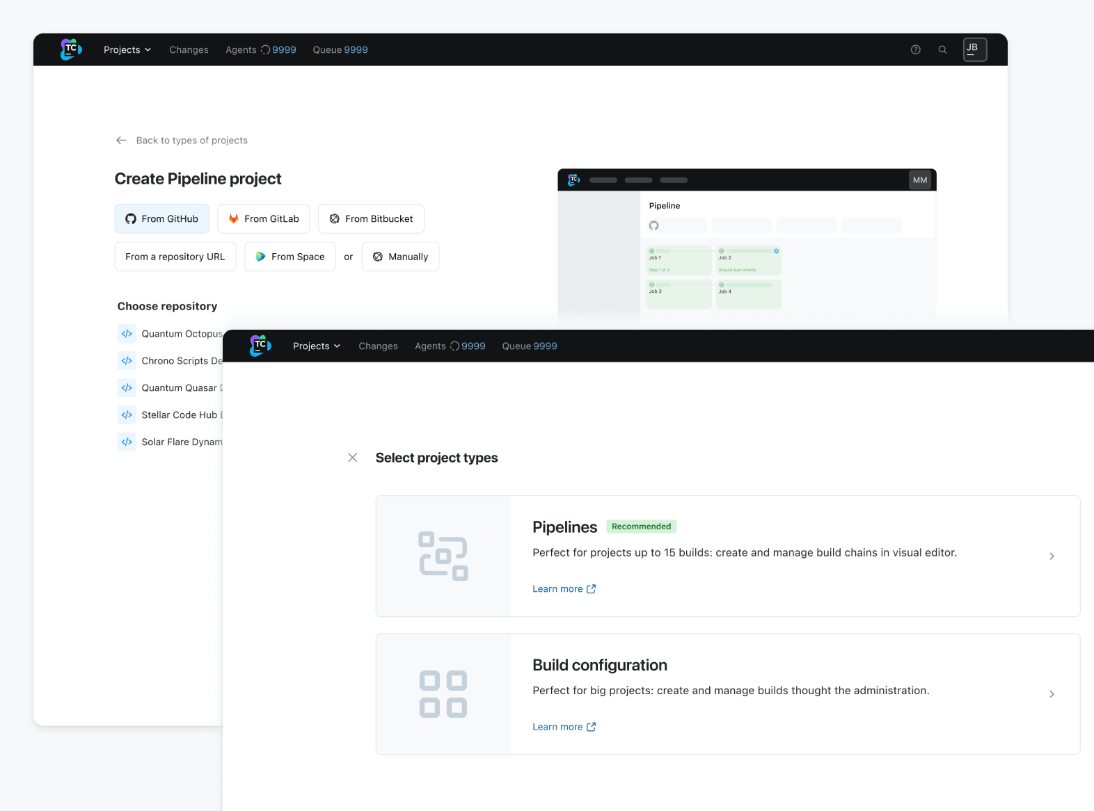 In the old UI, users were never sure what would happen after triggering the creation process – would it create a project, a build configuration, or both? Separating them into distinct flows brought much-needed clarity and predictability.