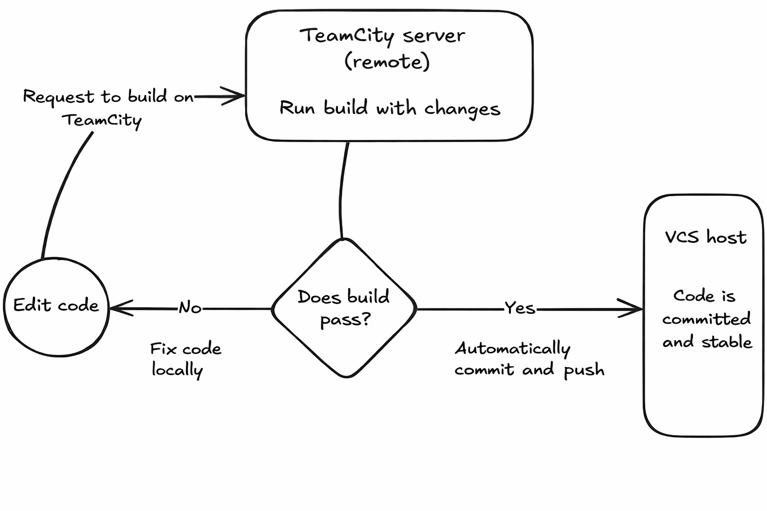 For distributed systems like Git, pretested commits are built around feature branches, so there’s no need to apply patches directly to the main branch. This keeps parallel development safe through local, isolated testing and committing. TeamCity can test against a temporary patch of staged changes you made locally, but stops short of performing the final automatic commit to avoid race conditions. Instead, it uses dedicated validation branches through what is known as the branch remote run.