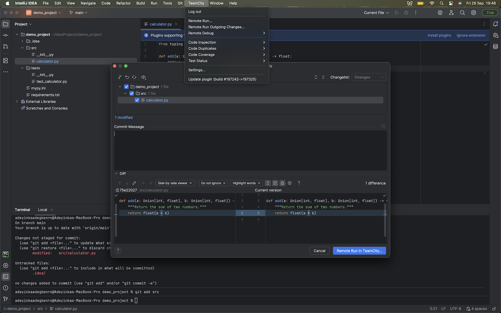 - IDE plugin setup: Using the pretested commit feature within an IDE (remote run) depends on the installation of the TeamCity IDE plugin. The plugin lets you select local, uncommitted changes and send them directly to the TeamCity server for verification.