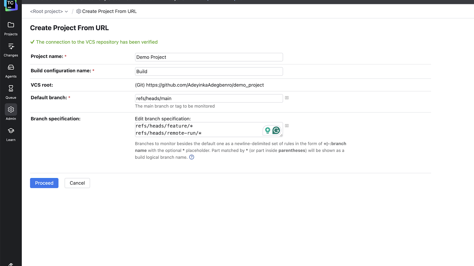 Click Proceed to continue to the build step.
