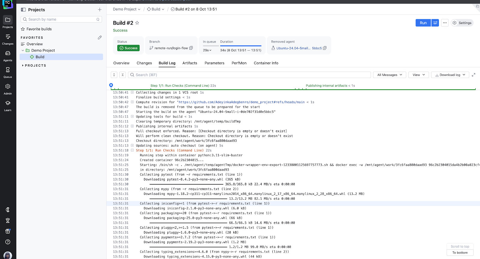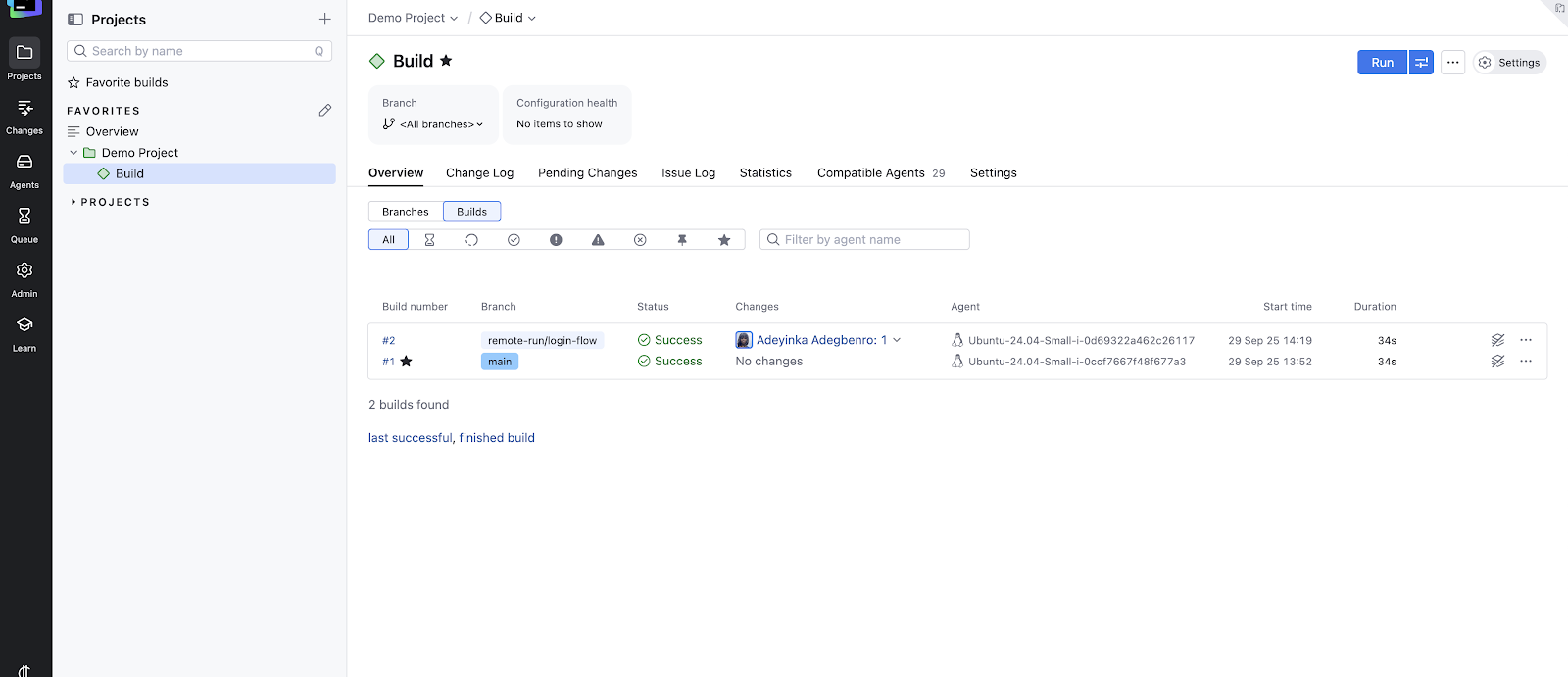 After you’ve added build steps, developers need to work on their isolated feature branch locally, making and committing changes frequently (e.g. a branch named feature/login-flow). To initiate the pretest, the developer pushes their local feature branch to the remote repository remote-run/ prefix. TeamCity automatically watches any branches with the prefix remote-run and will run an automatic build once code is pushed there.