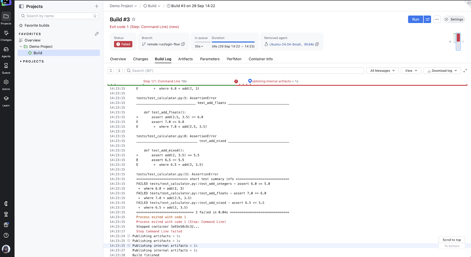 Once the remote-run/login-flow build completes, the status dictates the next step. If it fails, the developer reviews the build log, fixes the issues locally on their feature branch, and repeats the push to the temporary remote-run/login-flow branch.
