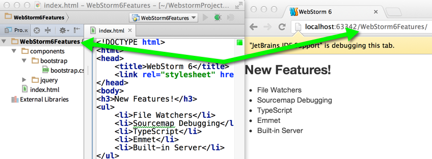 For example, if you’re working in a project called “WebStorm6Features”, you would open: http://localhost:63342/WebStorm6Features