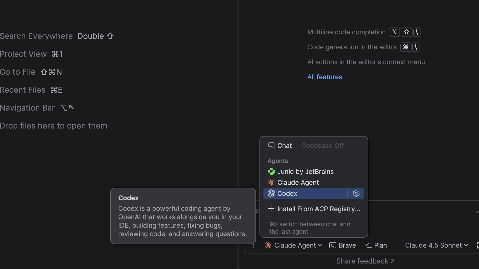 Junie, Claude Agent, and Codex available directly in the AI chat
