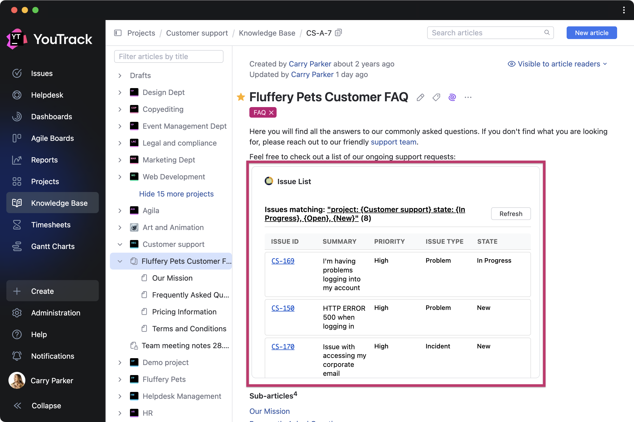 Issue List for Articles by MSP creates articles that always reflect the current state of your backlog or project work. Embed dynamic issue lists inside Knowledge Base articles by configuring a custom query (for example, “project: {Customer support} state: {In Progress}, {Open}, {New}”). The list will display matching tasks directly in the article, updating itself in real time.