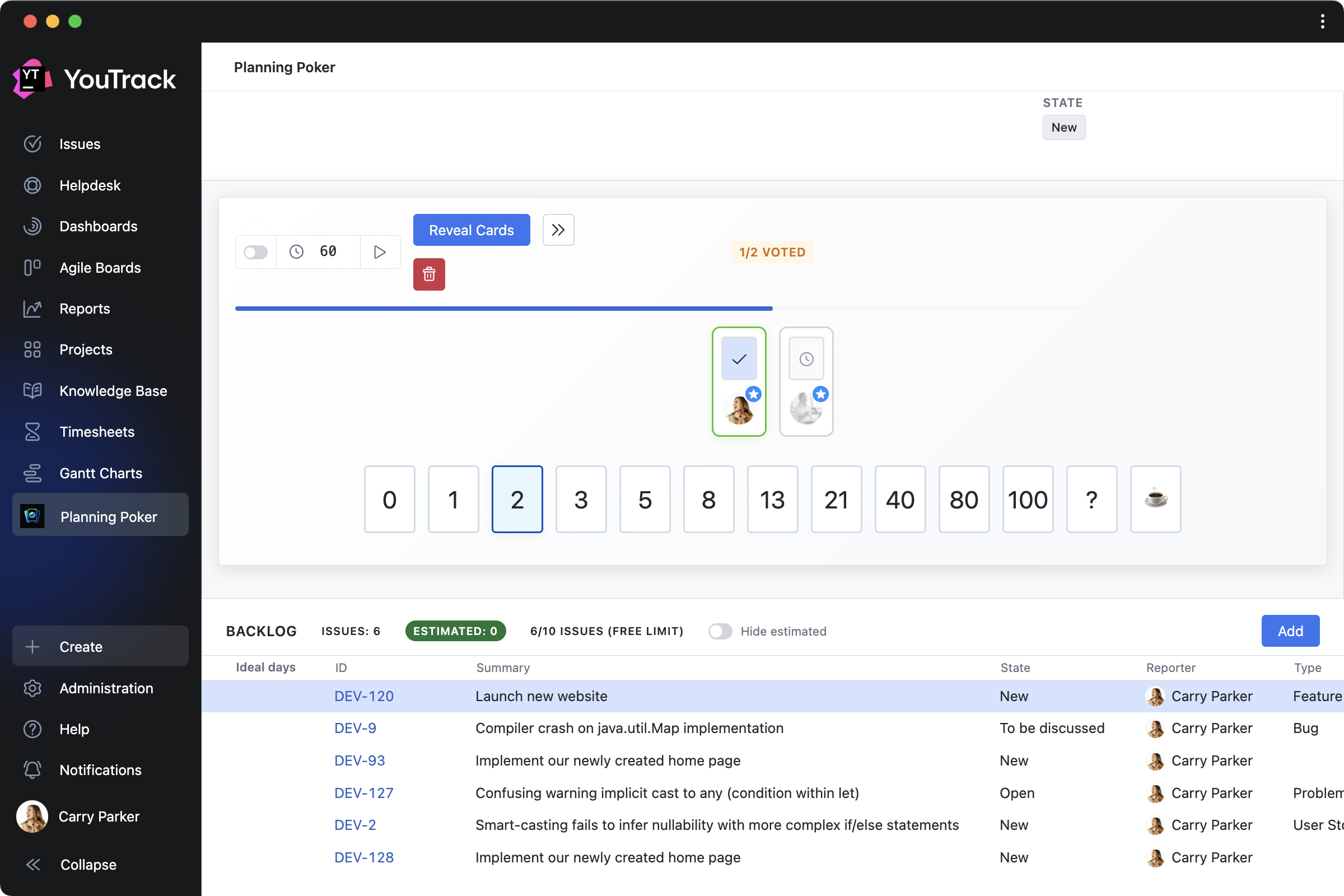 Planning Poker Estimation by Appfero is a collaborative tool that brings agile estimation sessions directly into YouTrack. Teams can create planning sessions, select tasks from their backlog, vote privately using digital poker cards, reveal estimates simultaneously, and then save the agreed-upon value directly to the task field.