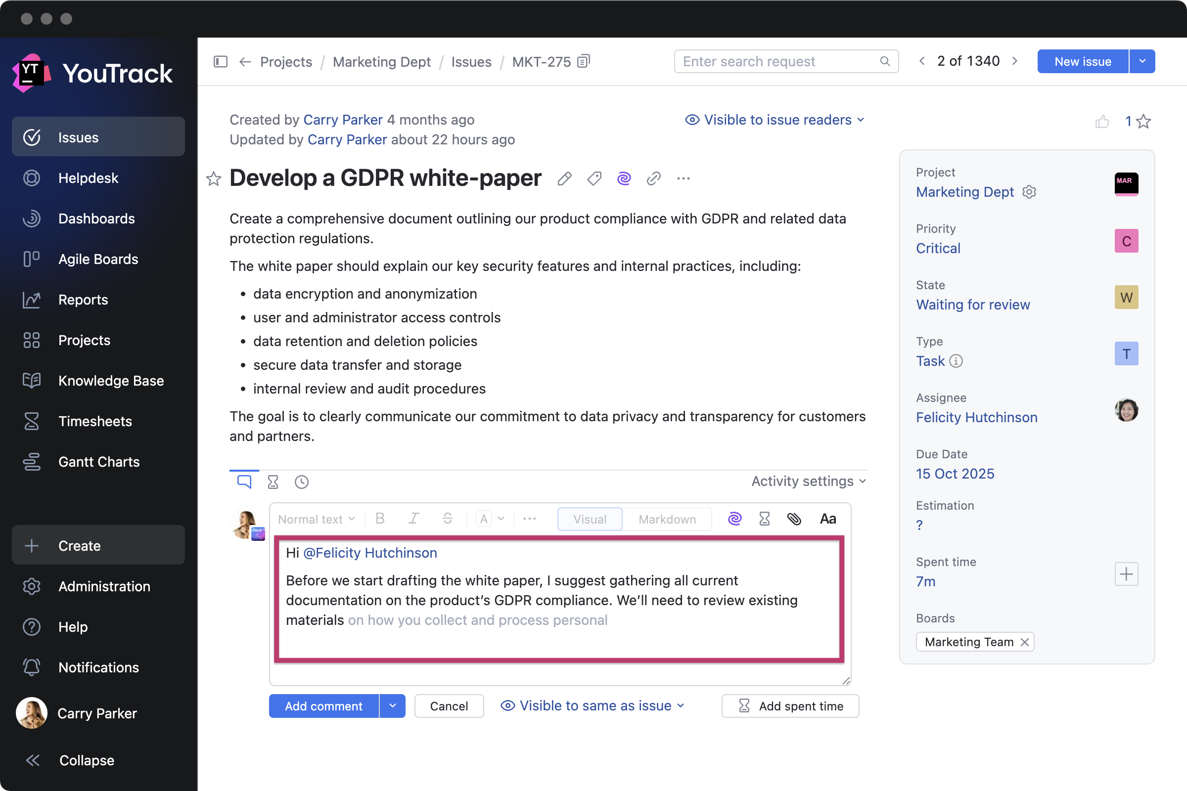 If you use AI agents for specific work scenarios, you can now make them operate with full context awareness. For example, developers can reference an issue assigned to them in YouTrack and direct the Claude Code agent to build a feature using the information described in that task.