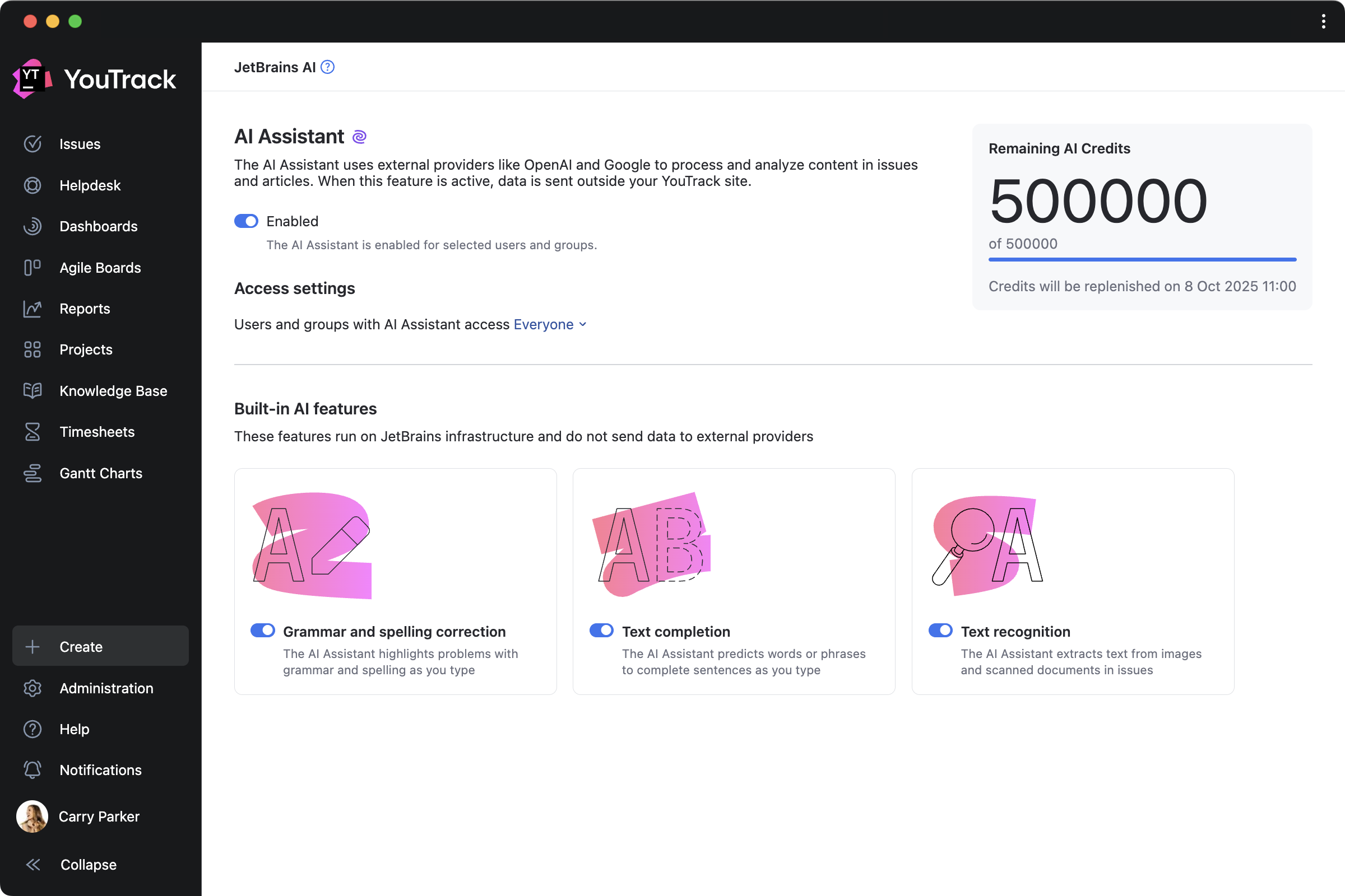 We’ve updated the AI Assistant settings page to give administrators more control over which features are active for your YouTrack. We’ve also added a dedicated tab to the profile settings, allowing each user to choose which features they want access to.