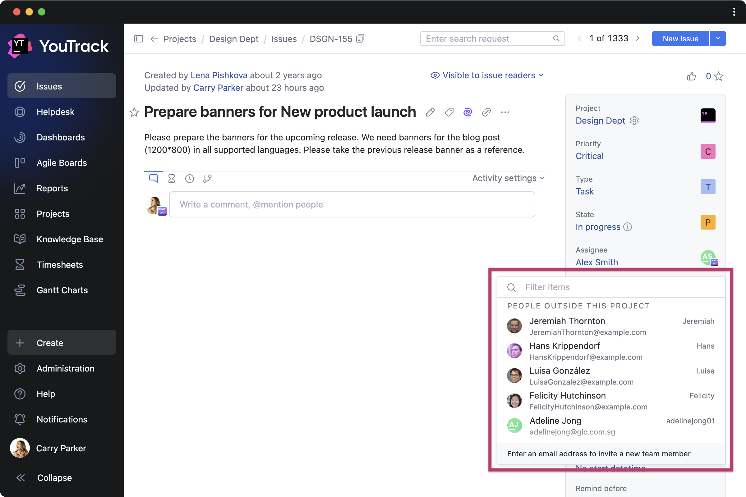 Administrators can now invite new users directly when assigning tasks, making it even easier to add people to your project. For example, when selecting a user in the Assignee field or any other field that assigns users, you can now choose people from outside the project, and they’ll be automatically added to the project team.
