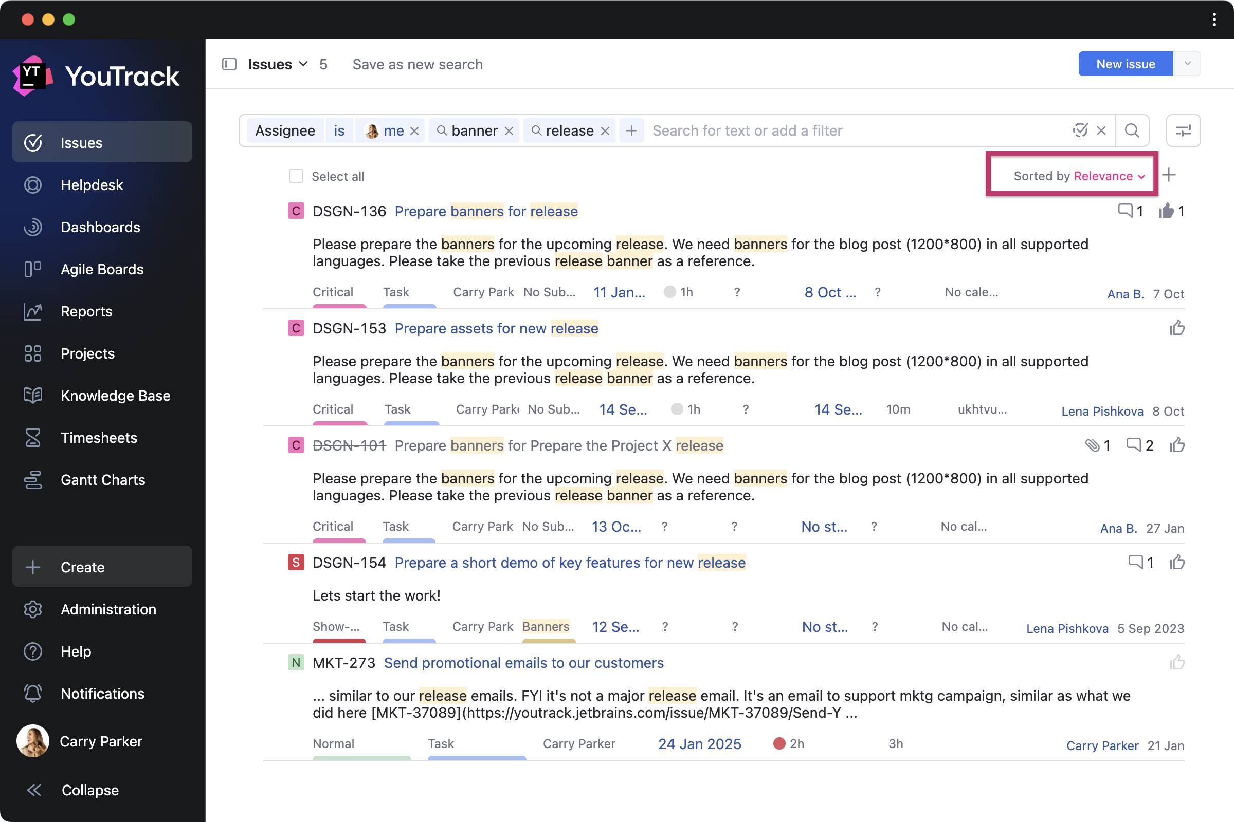 Another AI-powered enhancement brings a more powerful search experience in YouTrack. When searching on the Issues page, you now get more accurate results thanks to machine learning improvements. The most important tasks are listed first, based on attributes such as recency, user interactions, and personal relevance. These improvements cover various scenarios when you search for text, use dynamic filters, or build complex queries.