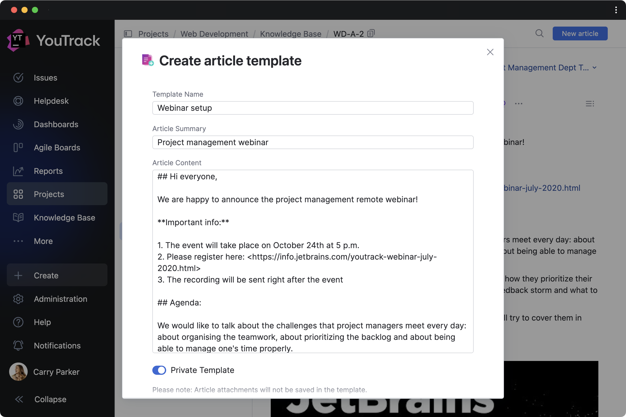 For teams working from their existing LLM, IDE, or agent platform, we’ve expanded the number of predefined actions available via YouTrack’s remote MCP server. You can now use AI-powered tools to find, create, and update Knowledge Base articles and create tasks with pre-configured visibility.