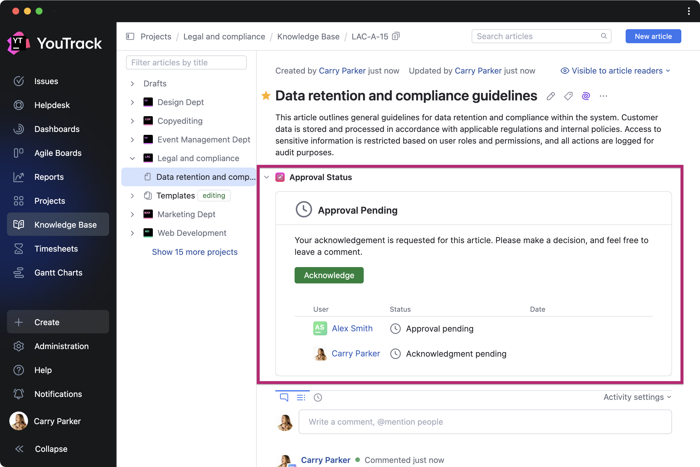 Article Approval by twenty20 is a paid app that allows teams to manage approval workflows directly in the Knowledge Base. You can invite approvers and acknowledgers for each article, set due dates, and track approval statuses.