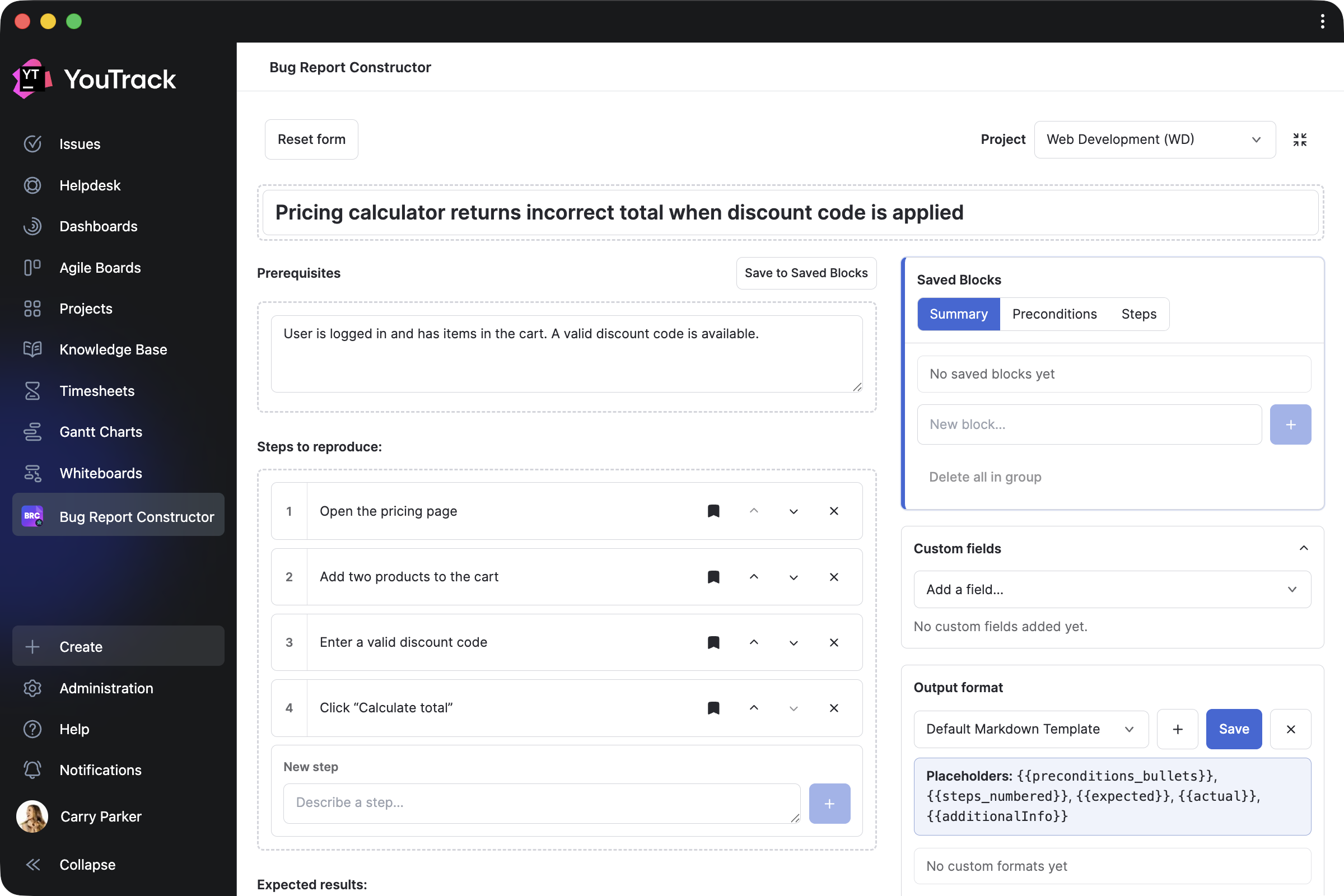 Bug Report Constructor by Evgenii Venediktov allows QA teams to collect bug reports using a single template and enables users to quickly create task drafts with pre-saved blocks.