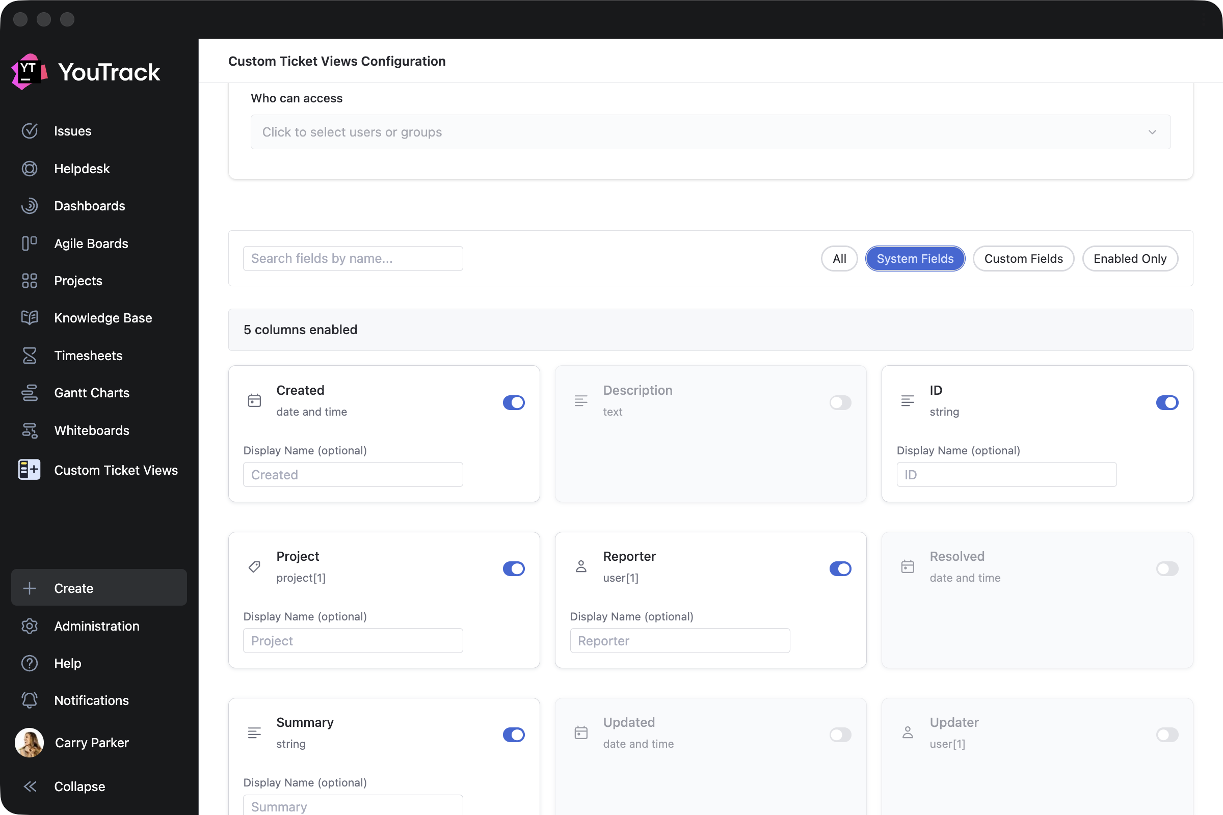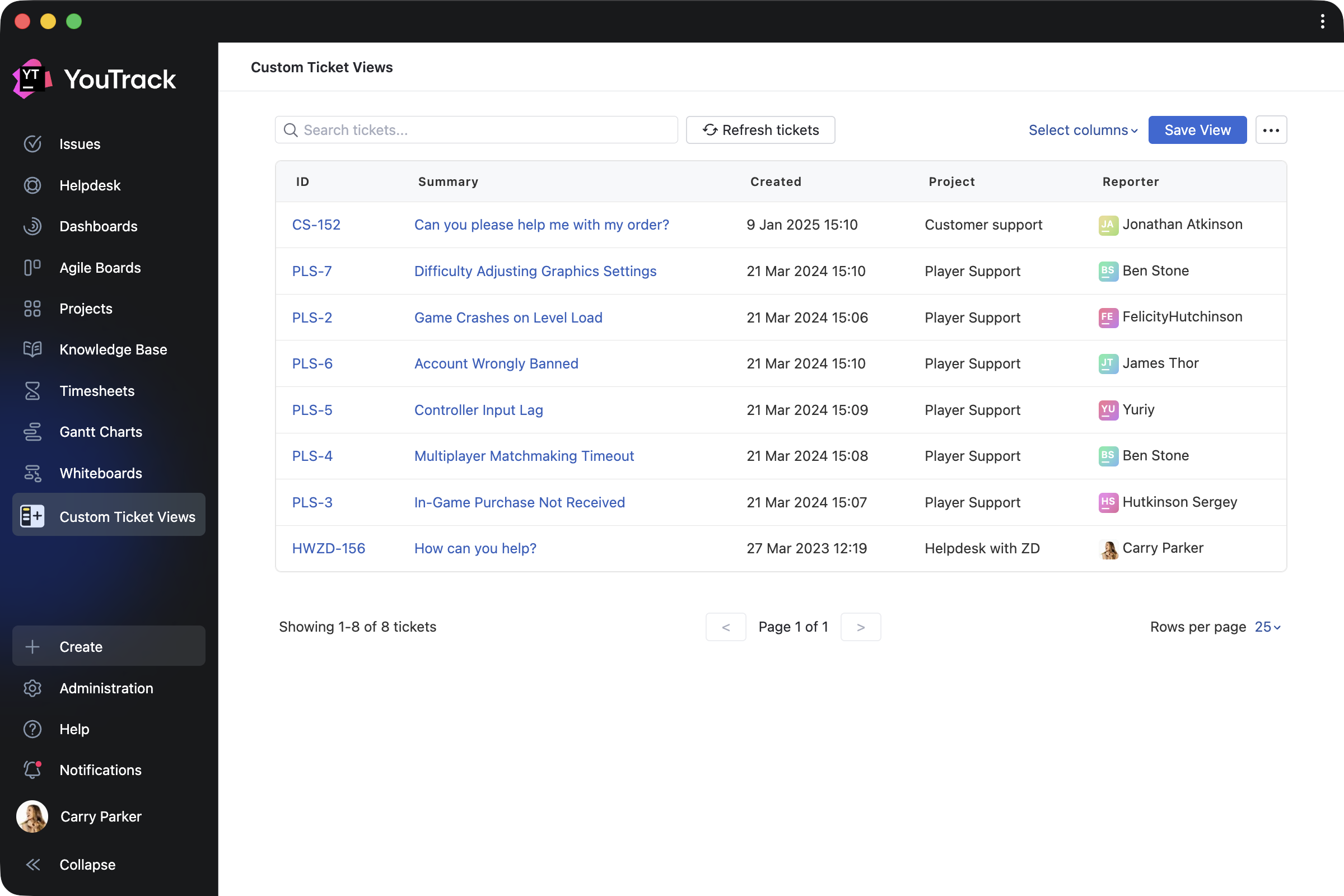 Custom Ticket Views by ​​Appfero is a paid app created to help support teams enhance reporters’ experience when working in YouTrack Helpdesk. It adds a new menu section that shows a reporter their submitted tickets in a customizable view.