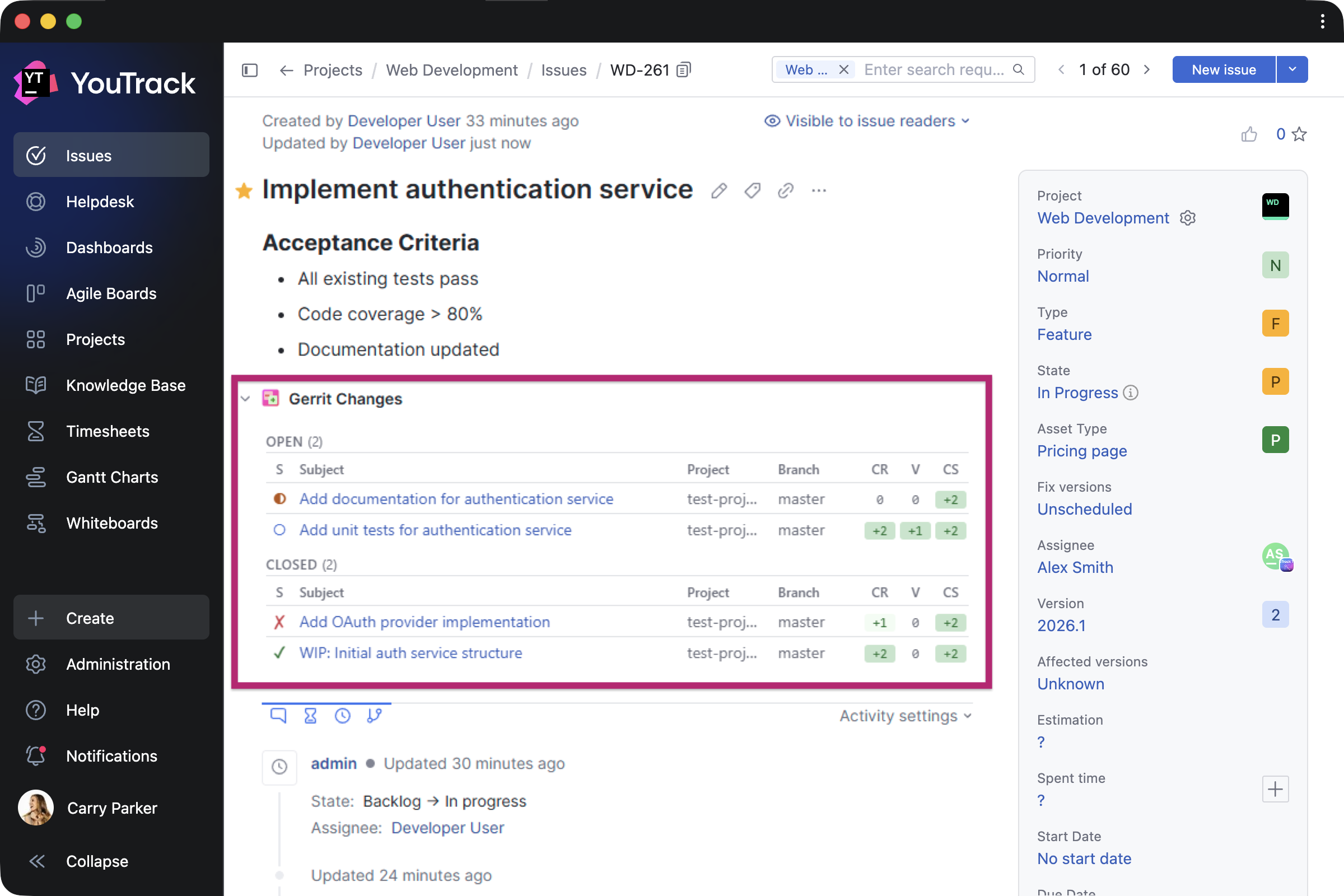 Gerrit Integration by Phoenix Systems helps developers display related Gerrit Code Review changes directly in tasks, including status, approvals, and links.