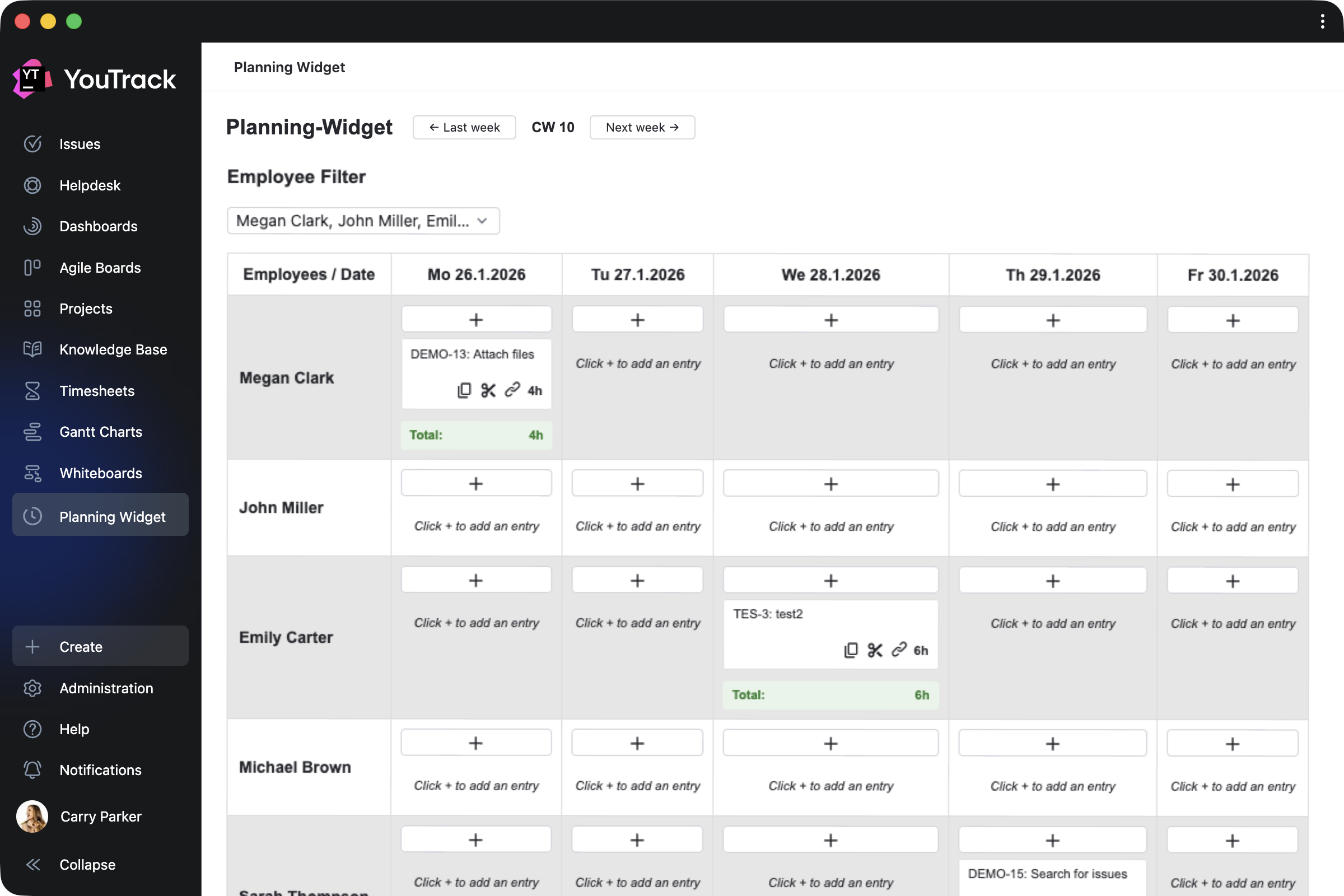 Planning Widget by CARL von CHIARI helps managers plan team activities in a calendar view. Review the tasks and tickets your team members work on each day, track time spent, and filter the view by employee.