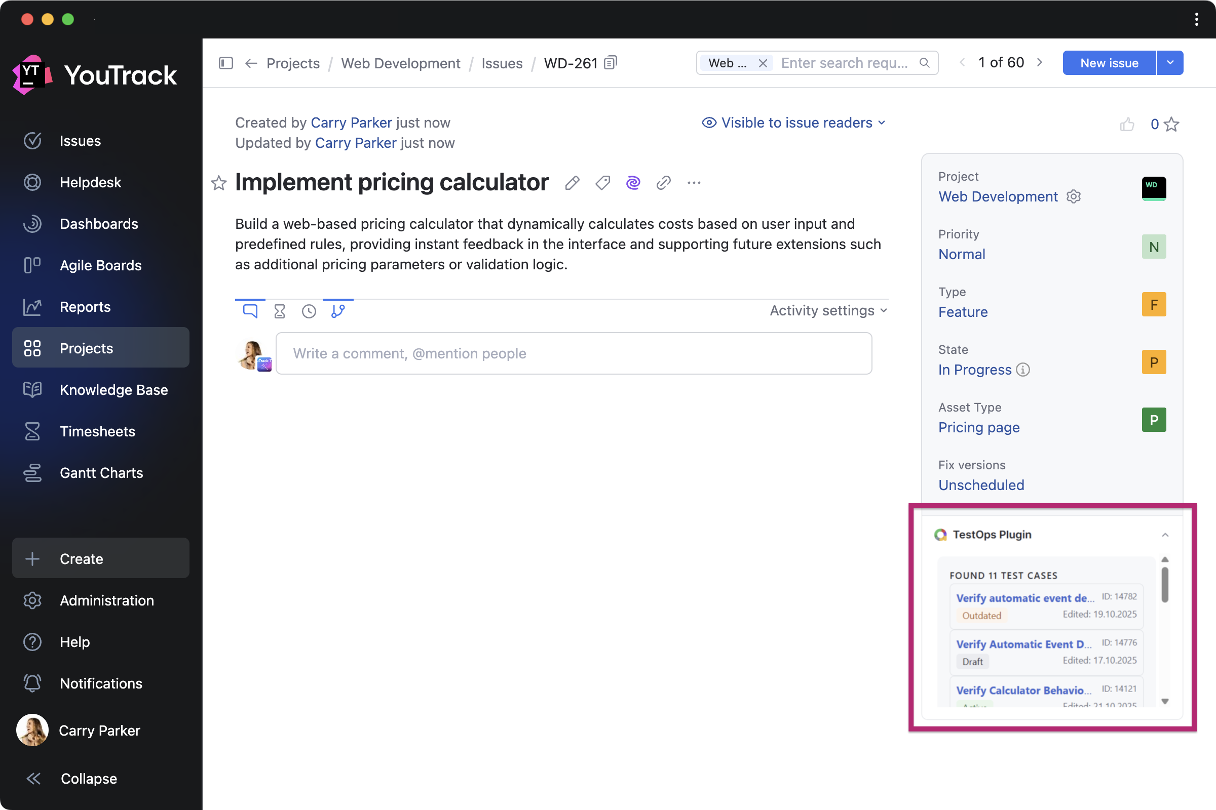 TestOps Plugin by bodm helps DevOps teams to stay on top of testing while developing features. It brings recent test cases from Allure TestOps directly into related tasks.