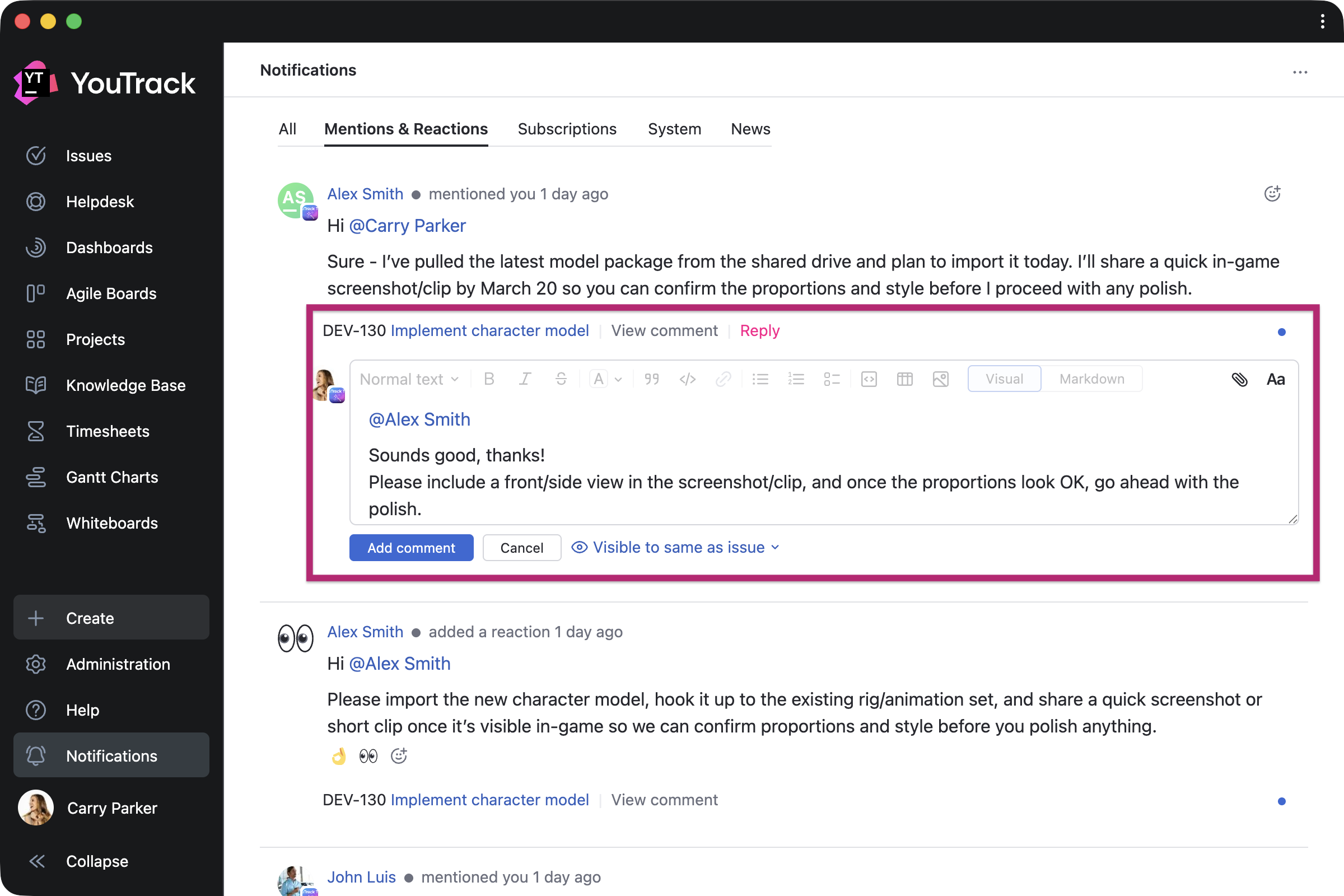 We’ve also streamlined project access management for administrators and improved the notification center experience for all users. For teams that rely on AI tools in everyday workflows, there are new ways to use YouTrack within your existing stack, including an n8n integration and new remote Model Context Protocol (MCP) server actions for the Knowledge Base.