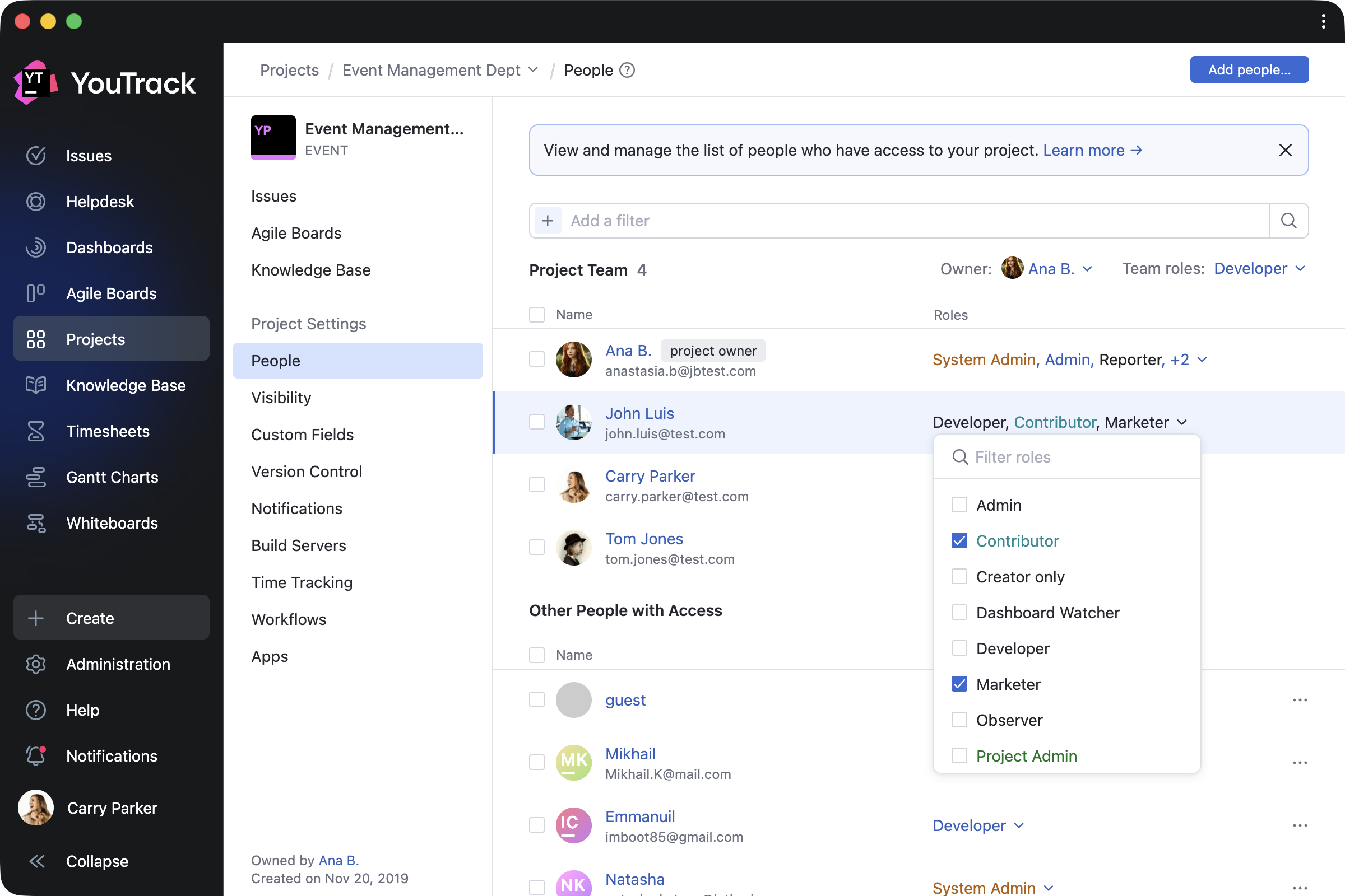 Here’s how it works in practice. When new team members join, you can add them to the project and assign their role right away. To manage existing project members, you can filter users and groups, then update or revoke their roles as needed. The People tab also lets you control access for people outside the project team, giving you a clearer overview of who can access your project.
